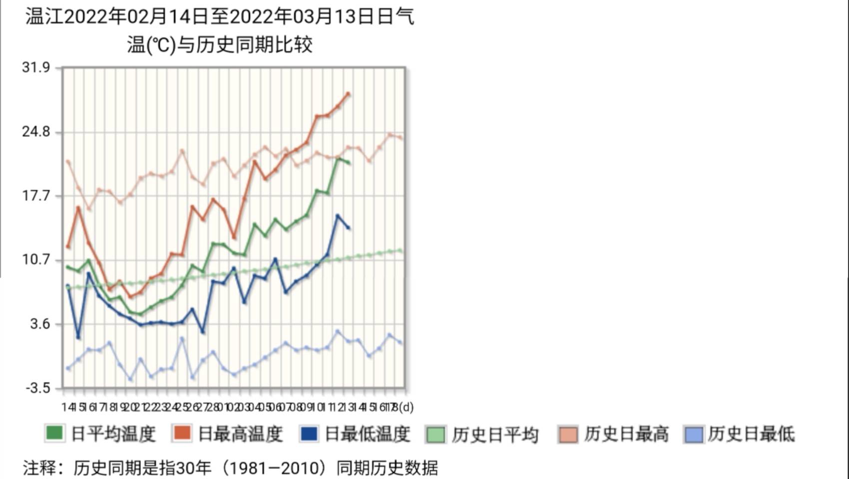 温江气象站2022年2月14日至3月13日气温与历史同期比较