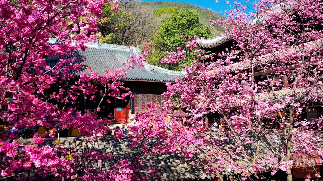 蓝天下,樱花漫枝,热闹而绚烂,洋溢着属于春天的温柔与明媚,春风吹过,满树樱花随风摇曳,淡雅清香在心中荡着阵阵涟漪,尽是令人陶醉的妖娆与芬芳。满树樱花绽放得轰轰烈烈,鸟儿在枝丫间跳跃,灵动的身姿为樱花之美增添了无限生机,漫步树下,闻着清香,聆听古刹禅音,如此景致实属独一份“春日限定”。