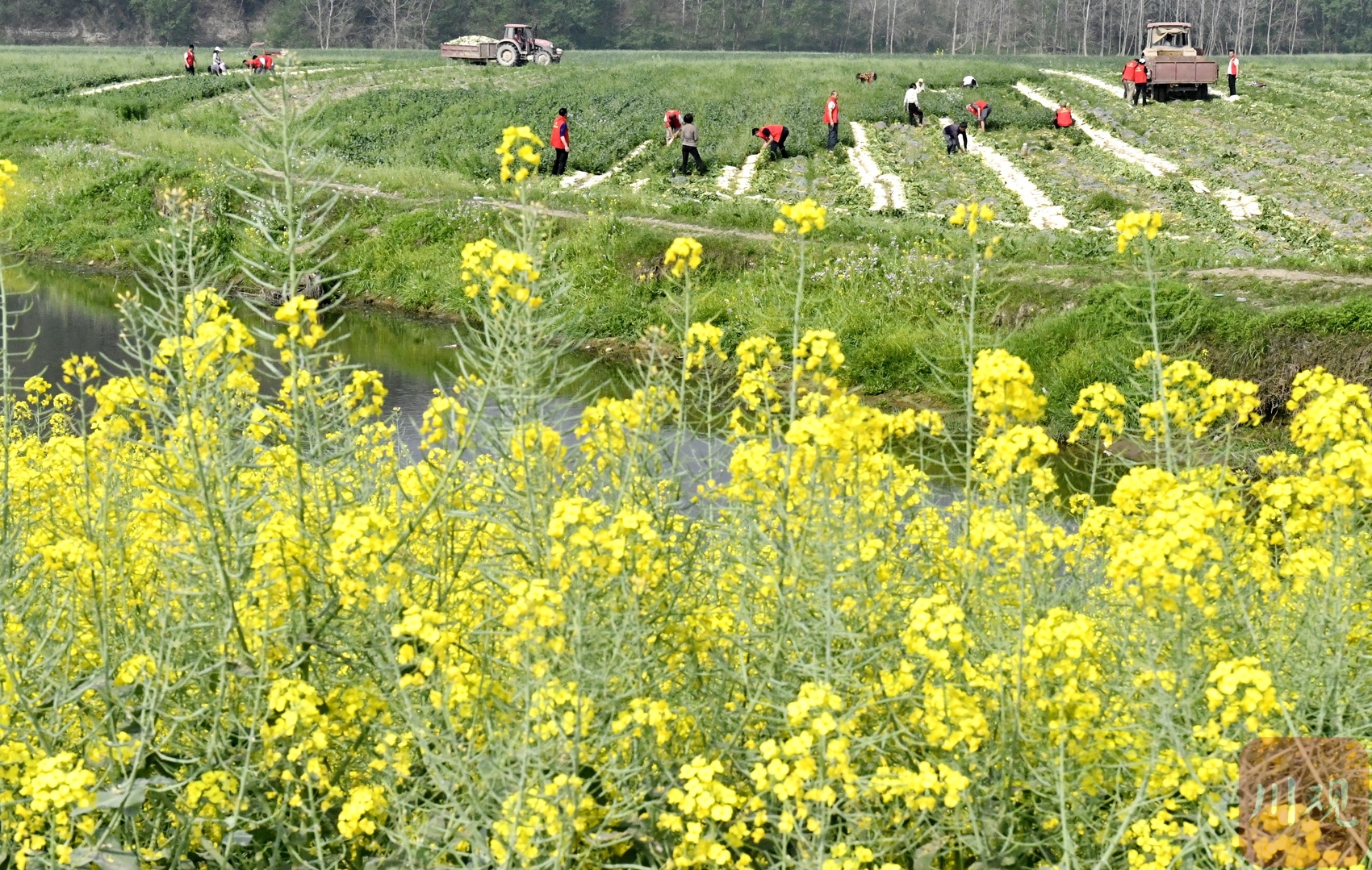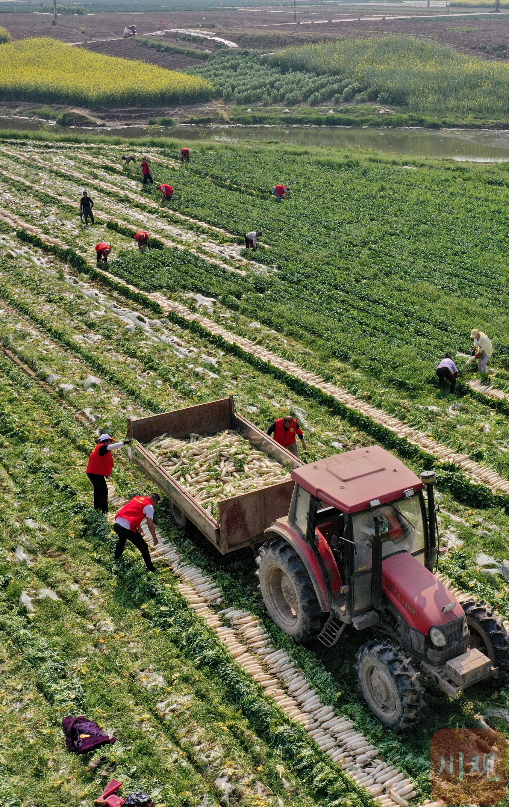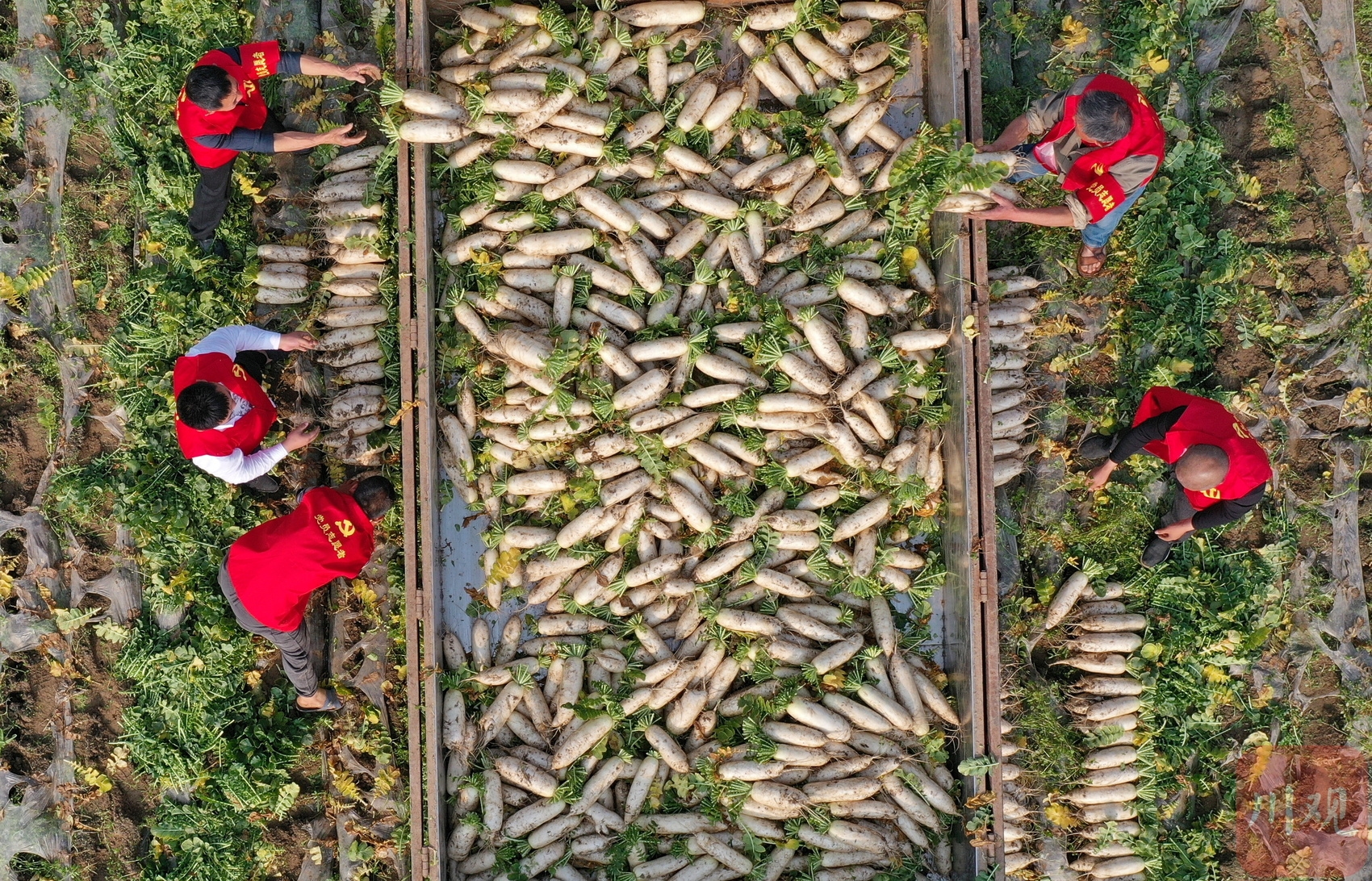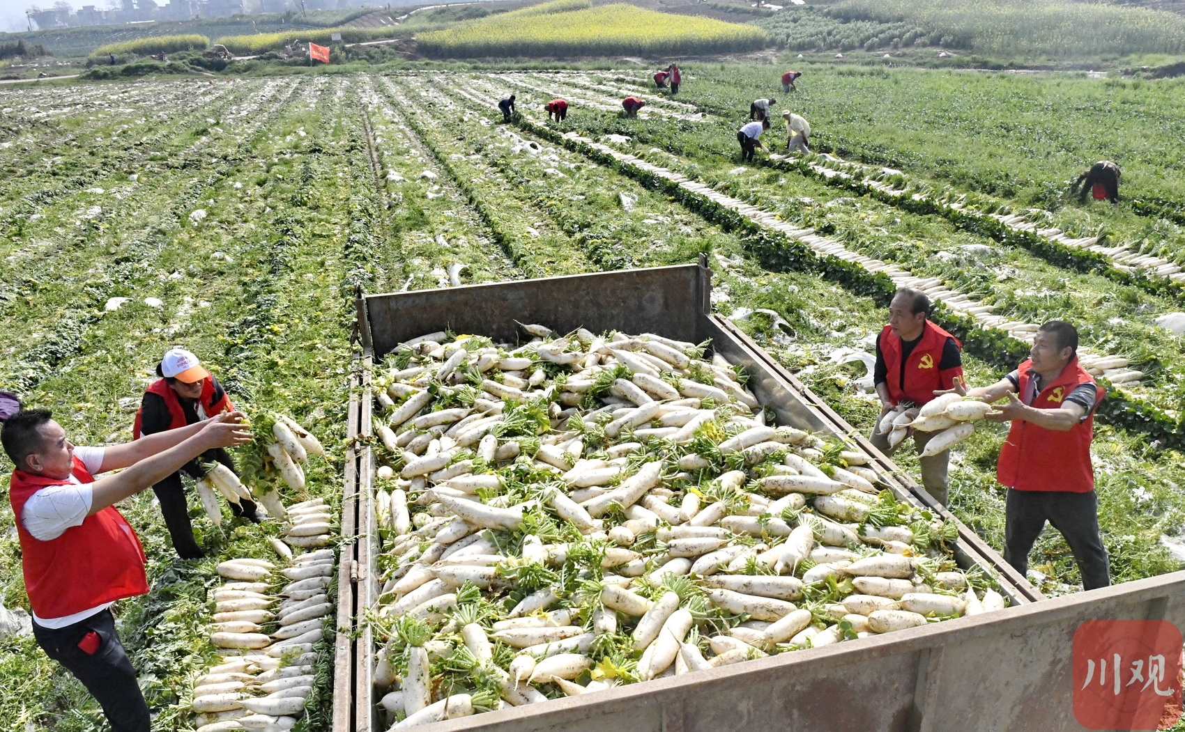3月15日,在南充市嘉陵区河西镇直属村,当地党员志愿者为种植大户抢收萝卜。