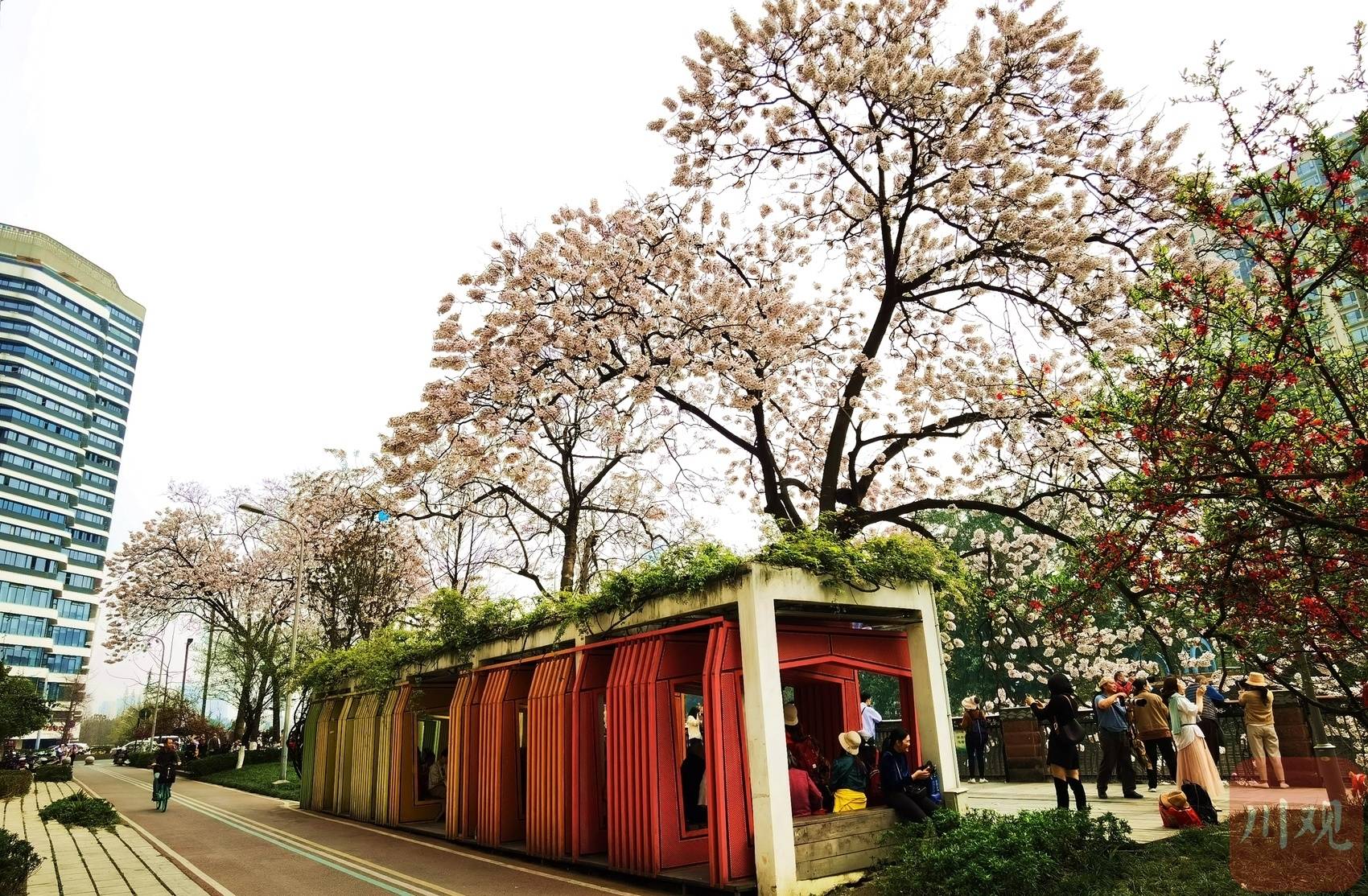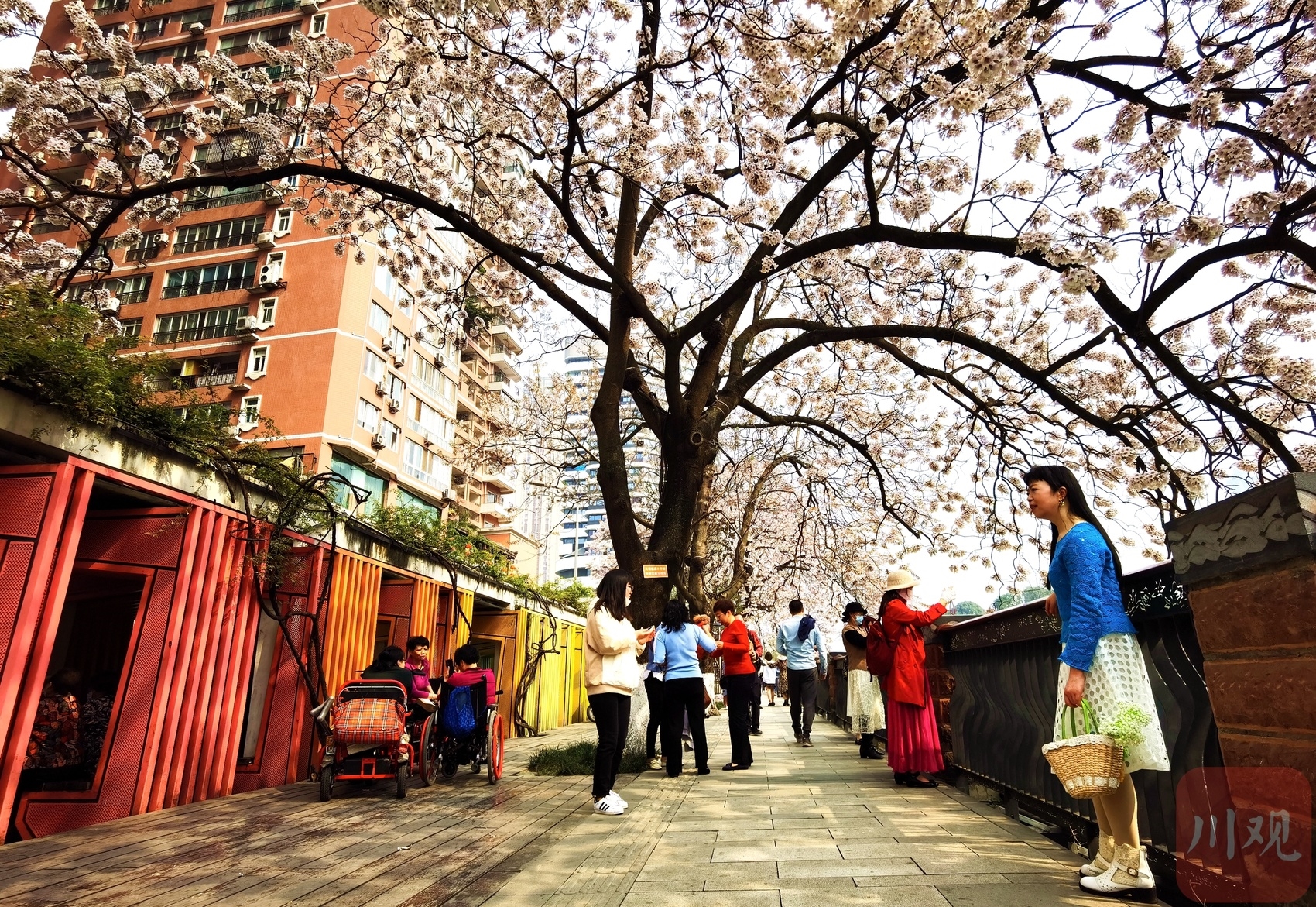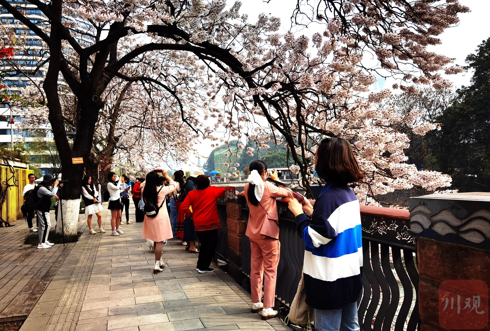 春光正好,在成都市红星桥星辉东滨河路府河边,又多了一处“网红打卡地”,许多市民专程跑来赏花拍照,河边上的几株泡桐树花正在阳光下热烈绽放,盛开的花朵像粉色的花雨伞,随手一拍,就是绝美大片。