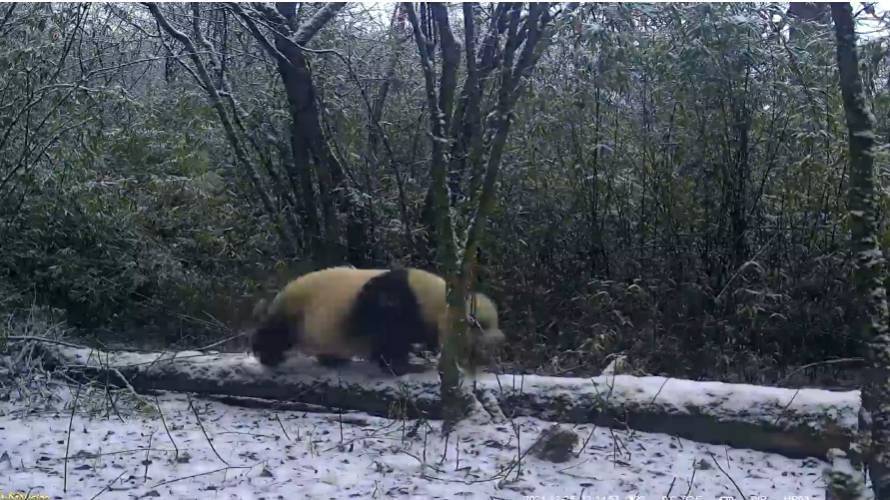 在另一段视频中,一只野生大熊猫在雪地里踩着“独木桥”练习“T台秀”,以悠闲的身姿走出了画面。