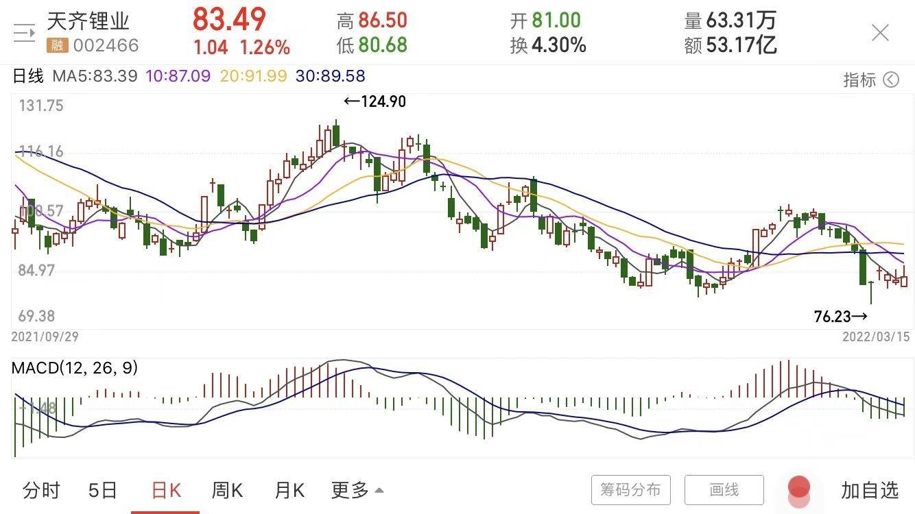在业绩实现反转之前,天齐锂业的股价已经提前实现上涨。从2020年4月30日盘中低价每股15.18元一路走高,在9月初甚至创下每股143.17元的历史高价。虽然后续股价震荡走低,但截至3月15日收盘,天齐锂业股价报83.49元,是之前的5倍有余。