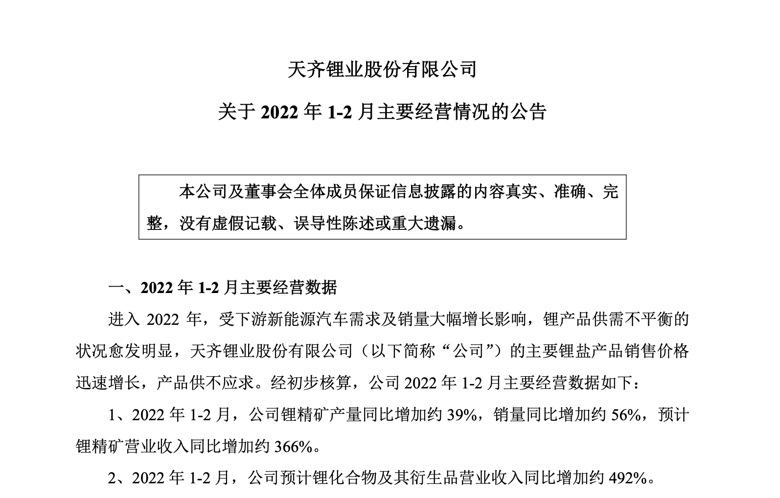 在实现扭亏为盈后,天齐锂业股份有限公司(简称:天齐锂业)经营情况持续向好。3月15日晚间,天齐锂业公布今年1-2月主要经营数据:经初步核算,锂精矿产量同比增加约 39%,销量同比增加约 56%,预计锂精矿营业收入同比增加约 366%;预计锂化合物及其衍生品营业收入同比增加约 492%。