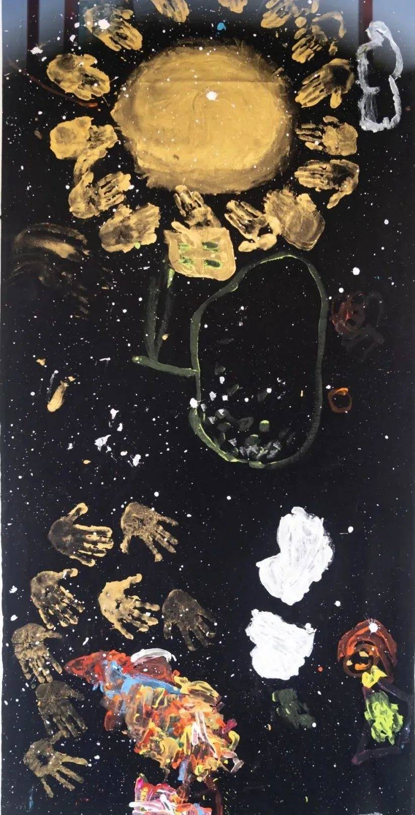 在另一件作品《童儿》里,3到5岁的小朋友成为创作主体。马俊回忆,在这个作品里,孩子们在十米长的布上,尽情发挥、释放。在这个过程中,马俊以旁观者和协助者身份出现,孩子们自由不拘的笔触,在布上交织、呼应,形成一幅童真又充满惊奇的画面。