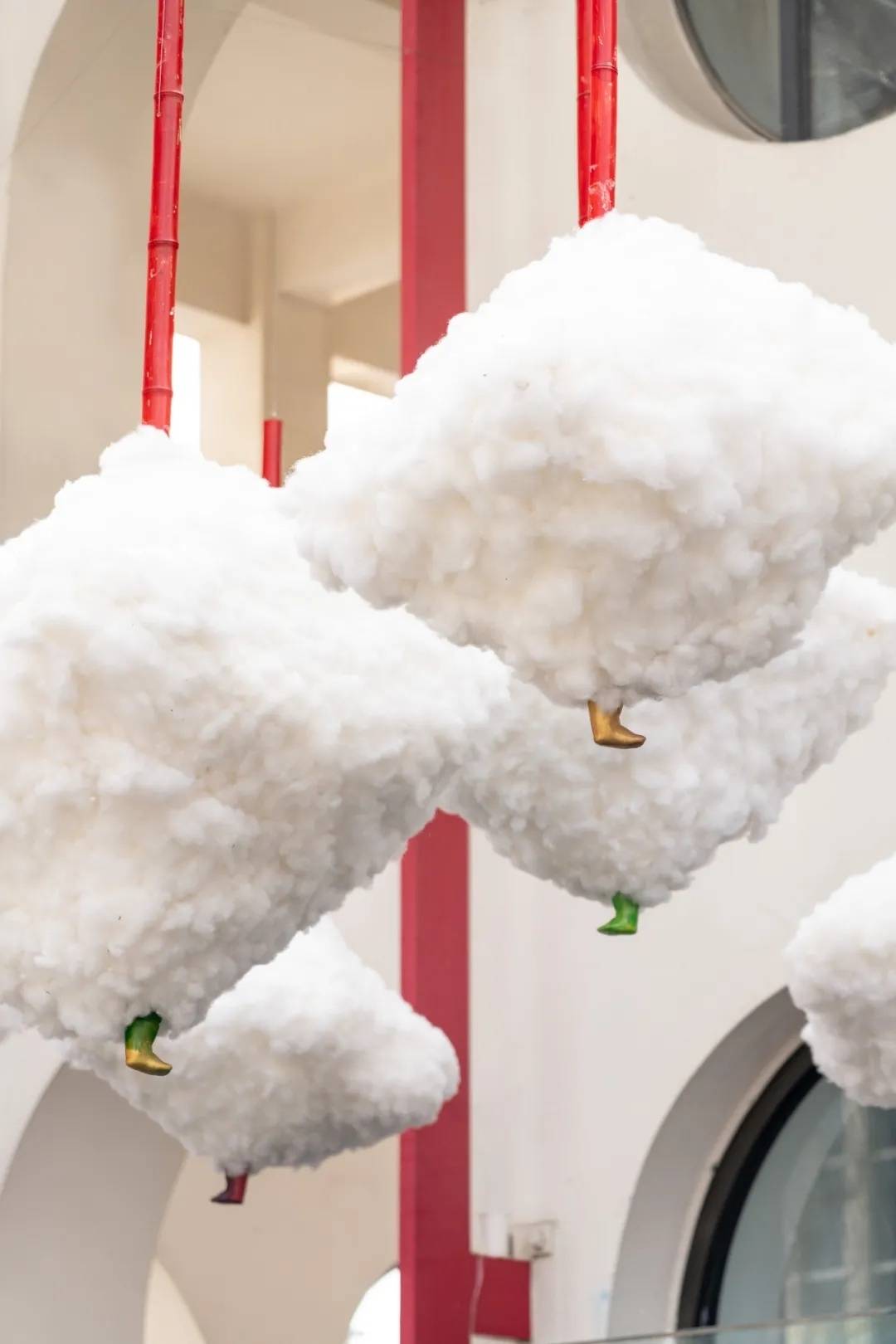 展厅外侧上空,悬空的棉花云轻盈纯洁,一只小脚从中探出来,俏皮而童真。在这件名为《时岁》的作品里,马俊想要表达对于儿童群体的关注。他解释,通过棉花一般的云朵,将孩童的稚嫩藏匿其中,露出的小脚,显示了儿童对于世界的好奇、探索。作品整体呈现了纯真、软嫩的状态,和儿童这种柔弱群体需要细心保护、关注的初衷吻合。