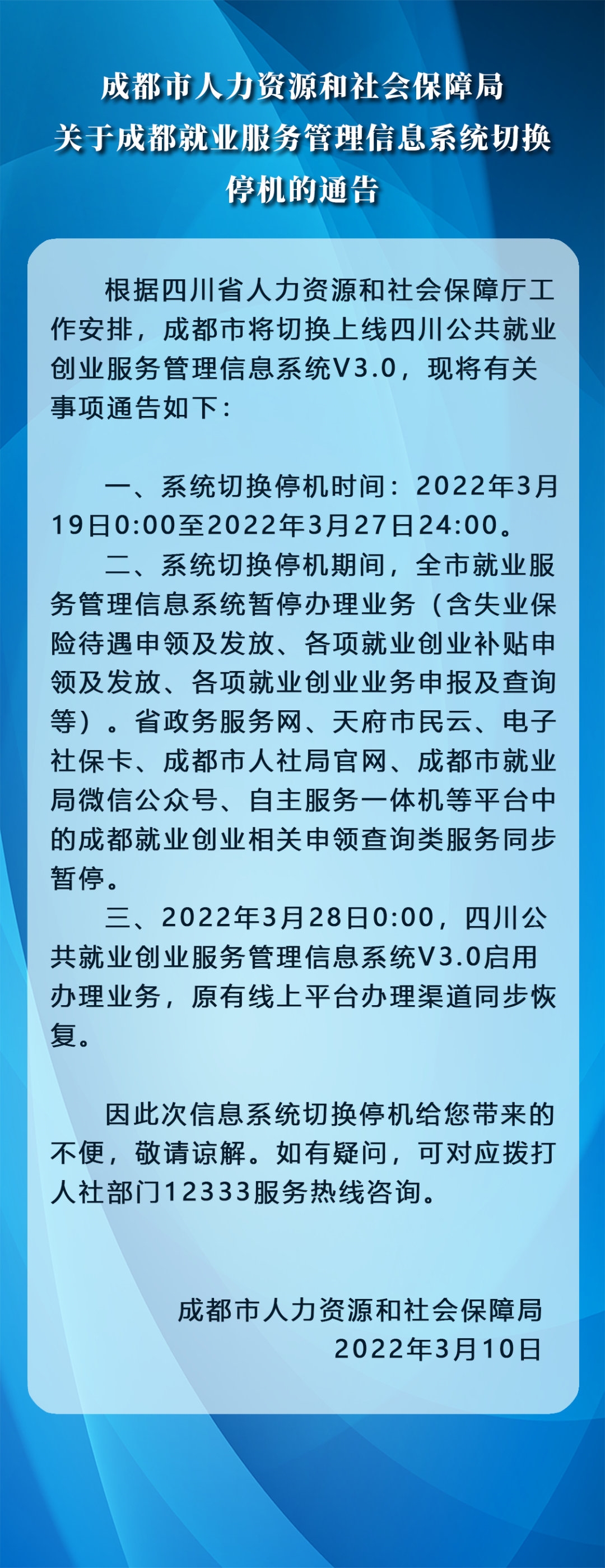 《通告》称,成都市将切换上线四川公共就业创业服务管理信息系统V3.0,系统切换停机时间:2022年3月19日0:00至3月27日24:00。