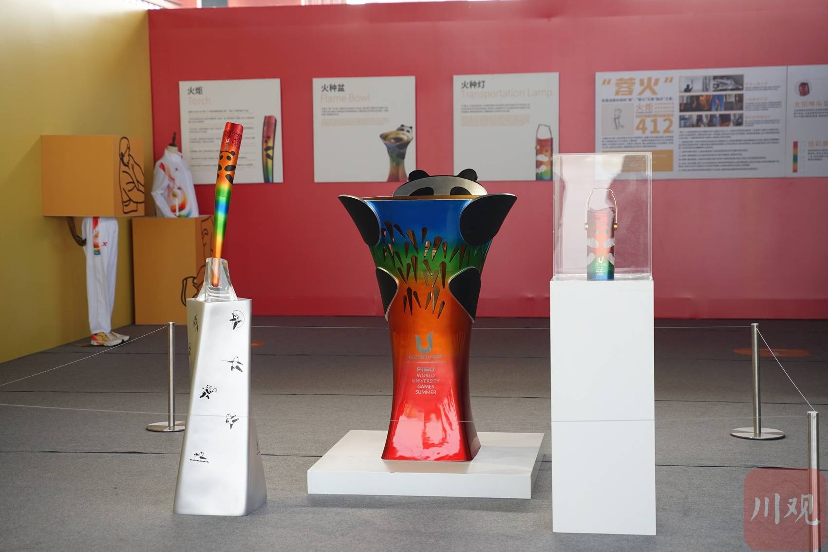 在成都大运会火炬巡展系列活动综合特展·天府新区兴隆湖站展览现场,市民可以近距离观看成都大运会火炬“蓉火”、火种灯、火种盆,还可以通过视频了解“蓉火”诞生的整个过程。展场以成都大运会火炬“蓉火”的四种颜色——朱红、明黄、翠绿、湖蓝分为四个空间,还包含了历届大运会简介和成都大运会介绍,深圳大运会火炬、喀山大运会火炬、北京大运会火炬塔模型等实物展陈。
