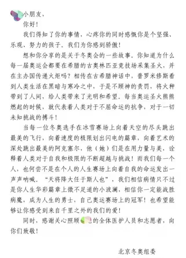 信中,组委会向木木分享了奥运圣火的起源及意义、冬奥健儿的超越与挑战,以及对木木的鼓励:“每当奥运圣火熊熊燃起的时候,就代表着人类对于不屈命运的抗争,对于一切未知挑战的搏斗……我们相信病情只不过是你人生华彩篇章上微不足道的小波澜,相信你一定能战胜病魔,成为人生的勇士,自己奥运赛场上的冠军!也希望能够让你感受到来自千里之外的我们的爱!”