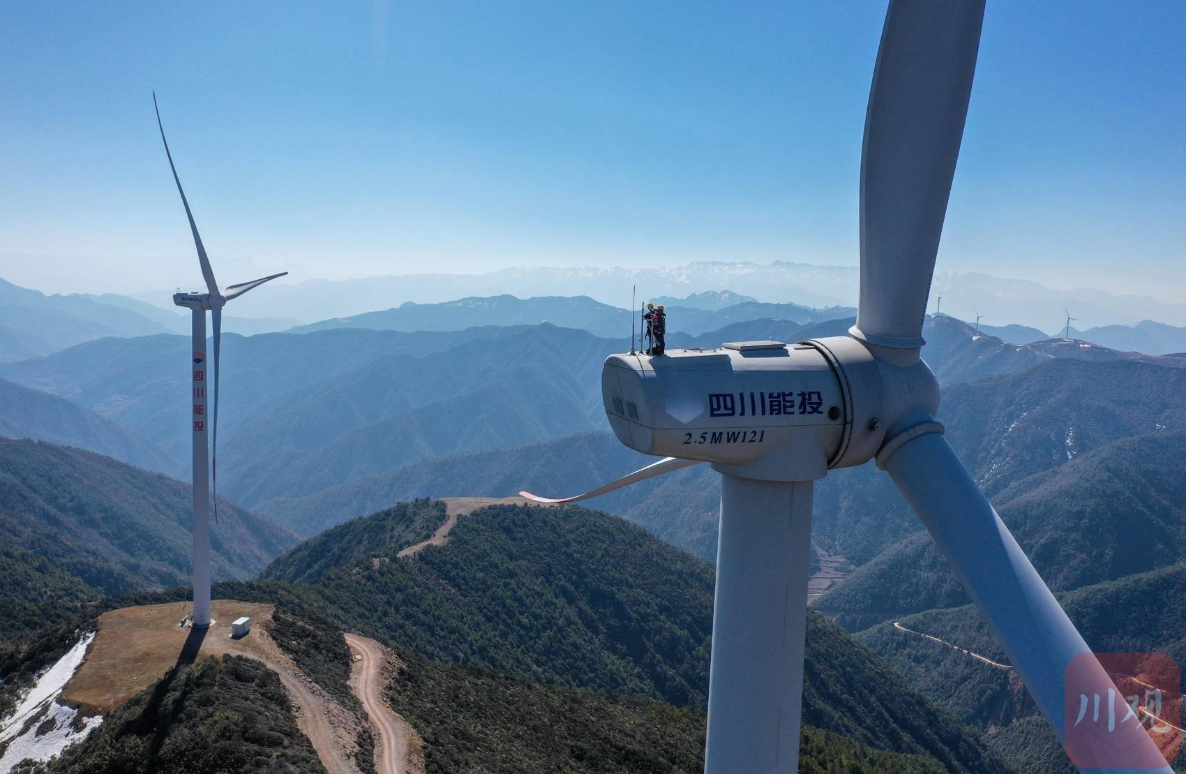 3月9日,四川能投会东新能源开发有限公司检修工马旭阳和同事在凉山州会东县拉马风电场90米高的风机上检查。