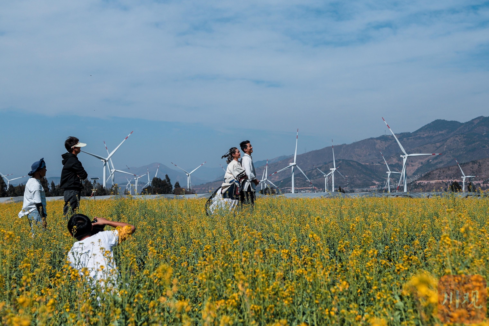 3月12日,一对年轻人在安宁河谷以风机为背景拍照。