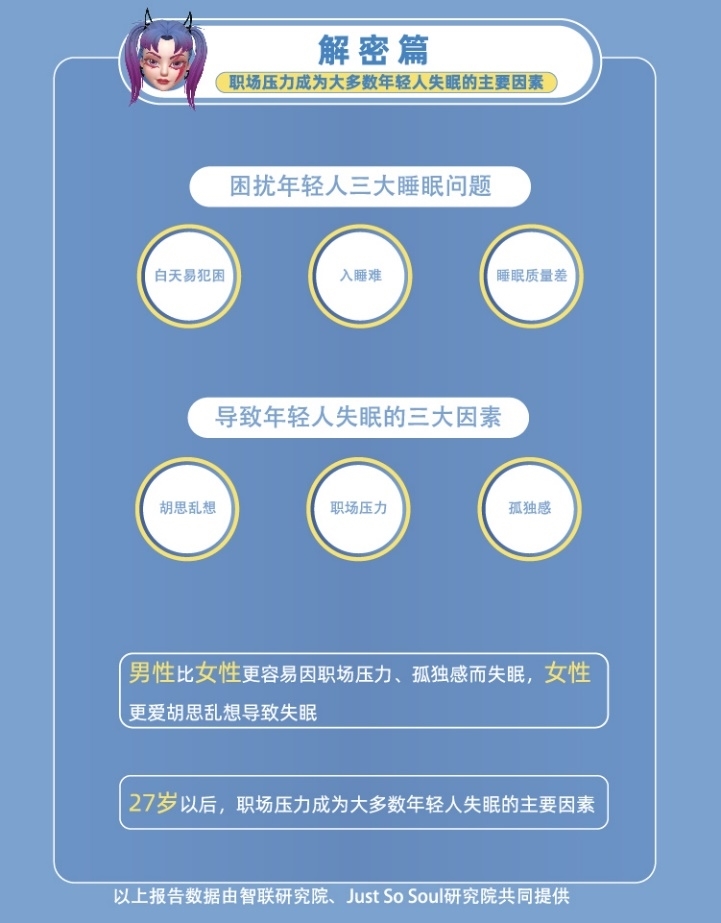 《报告》显示,熬夜、缺觉已经成为大多数人的普遍烦恼。而随着年龄的增长,职场压力的增加,上班族的焦虑也转化成种种失眠的动因,值得全社会共同关注。