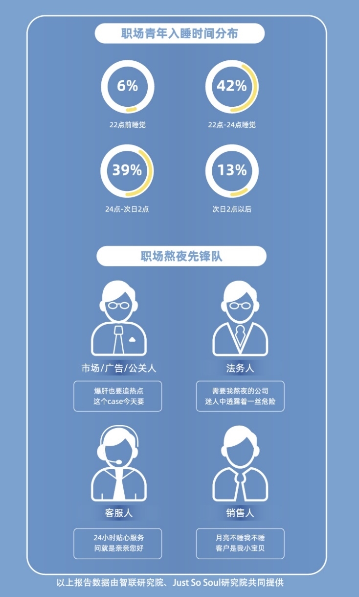 从职场维度来看,交通物流、房地产建筑业、IT互联网成为最缺觉的三大行业;市场、广告、公关、法务、客服、销售等工种更容易熬夜。
