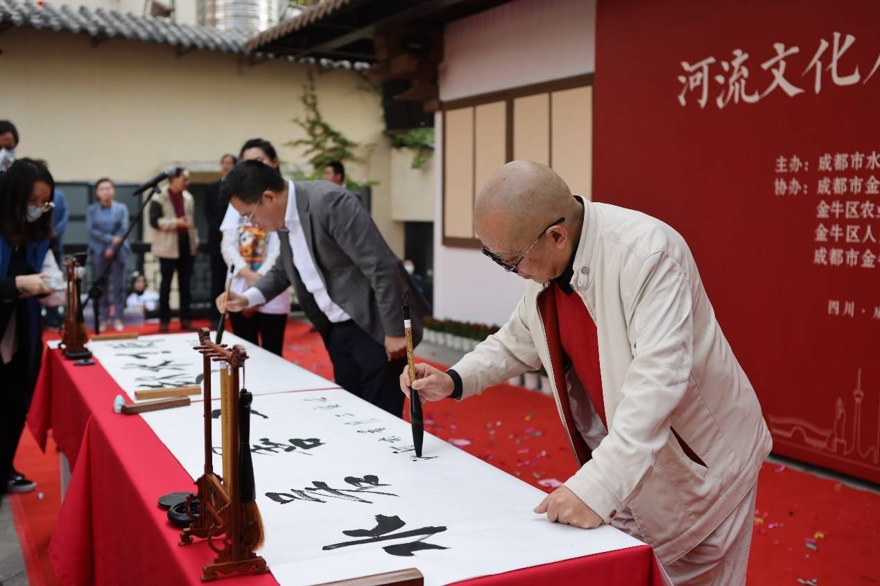 因当前疫情形式严峻,此次河流文化馆开馆仪式采用线上直播的方式,成都市水务局、成都市河道监管事务中心、金牛区农业和水务局、金牛区西安路街道办事处、金牛国投集团等有关部门和单位的负责人参加了开馆仪式。开馆仪式还邀请到成都书画家魏爱臣和刘德扬参加,为河流文化展示馆题词。