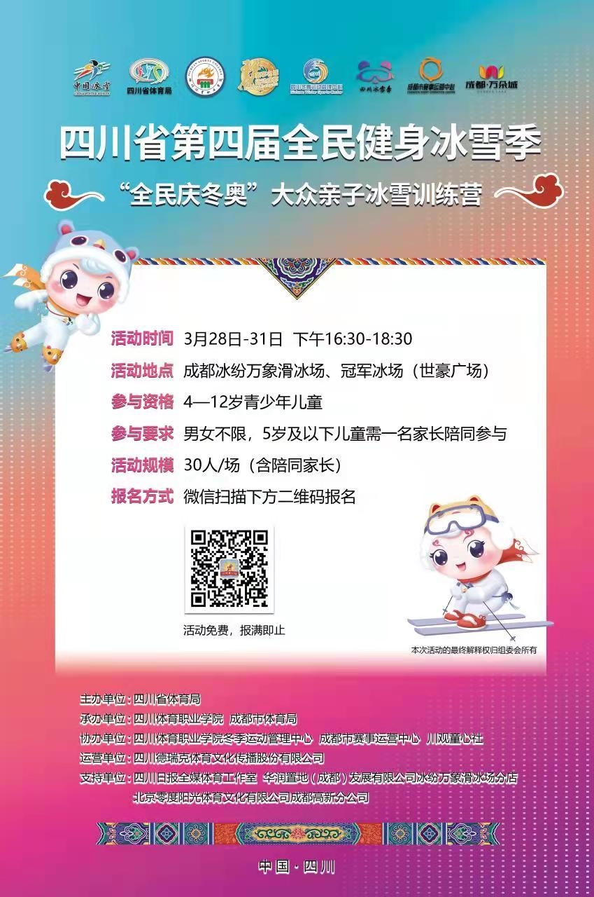 刚刚落幕的北京冬奥会在四川掀起了一股“冰雪热”。作为具有代表性的冰雪运动之一,“滑冰”成为春暖花开时节最时尚的生活方式之一。为延续冬奥激情,让全民乐享冰雪运动,由四川省体育局主办,四川日报全媒体育工作室协办的四川省第四届全民健身冰雪季活动之“全民庆冬奥”大众亲子冰雪训练营将于3月28日-31日开展,4-12岁青少年儿童可免费参加训练。