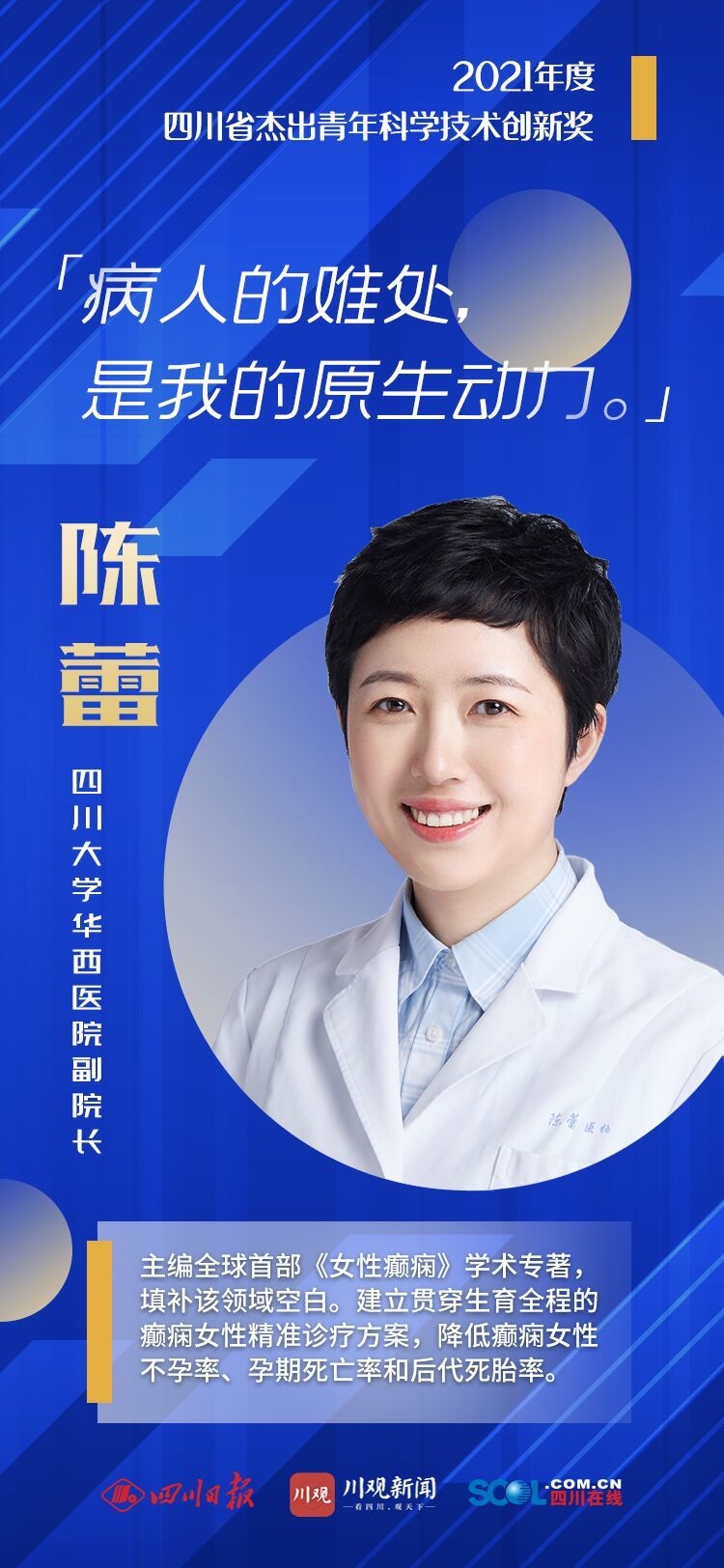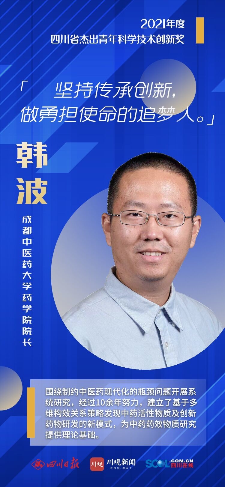 2021年度四川省科学技术奖首次设立“四川省杰出青年科学技术创新奖”,奖励在科技基础研究和应用开发中取得重大成果的青年科技工作者,为他们开辟单独支持渠道,进一步激发青年人才创新活力。该奖获得者于提名当年1月1日应未满40周岁,且提名年度在川工作。
