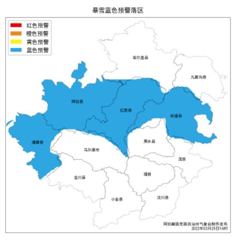 3月25日下午,四川省甘孜州、阿坝州气象台先后发布暴雪蓝色预警,请相关区域单位和人员加强防范。