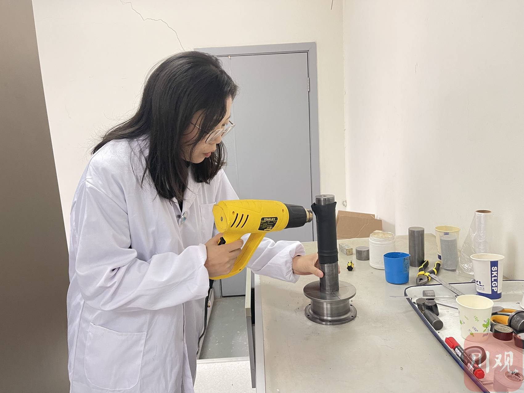 把岩石样本套上热缩管,用热风枪对其均匀加热,待完全贴合后,再将样本放置到试验机上,随后按下启动装置……实验室内,范宣梅给学生们演示着岩石强度测试的操作流程。