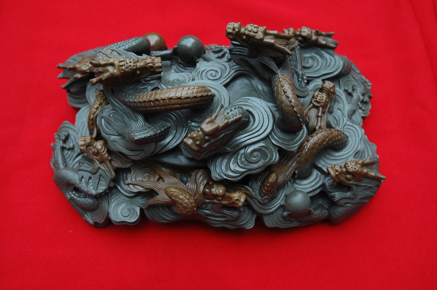 刻砚时,当地民间艺人会巧妙地运用黎渊石天然具备的灰、棕、橙、青等色泽,雕刻出龙、凤、花、鸟、虫、兽、山水等图案。在各式黎渊砚中,代表作“神州九龙砚”声名遐迩,是中国民间艺术瑰宝。2008年,黎渊石雕艺术被收入四川省第二批非物质文化遗产名录。