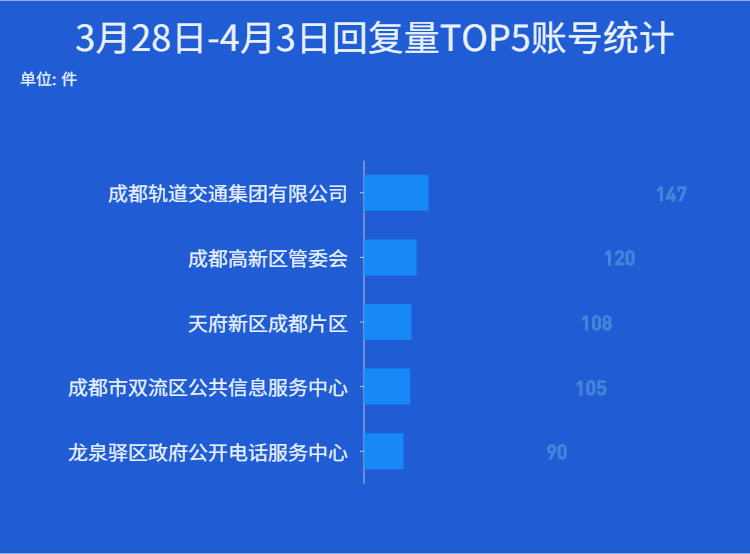 从具体接件办理单位来看,全川转办回复量排名上前五的账号分别为: