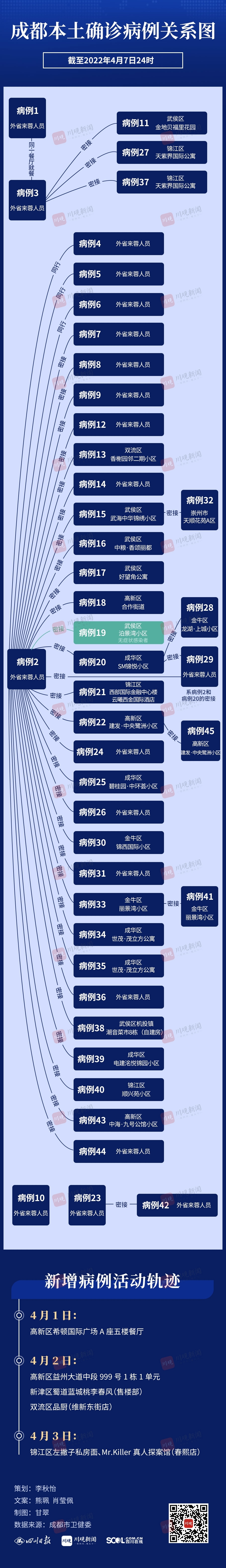 4月8日,成都市卫健委官方微信发布消息:4月7日0-24时,成都市新增本土确诊病例4例(其中1例系昨日通报的无症状感染者订正),无新增本土无症状感染者。截至4月7日24时,成都市本轮疫情累计报告本土确诊病例44例,本土无症状感染者1例。