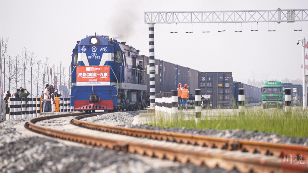 4月8日上午10时,一列满载集装箱车厢的国际班列从成都(双流)空铁国际联运港发出,其终点站是老挝万象。车身上,“四川西部陆海新通道班列”标识醒目。