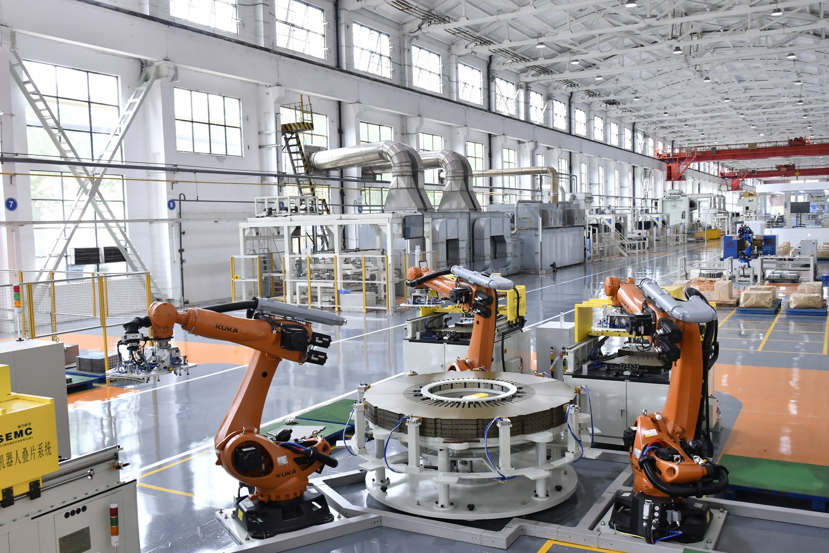 东方电机定子冲片数字化车间内,正在进行定子冲片生产。