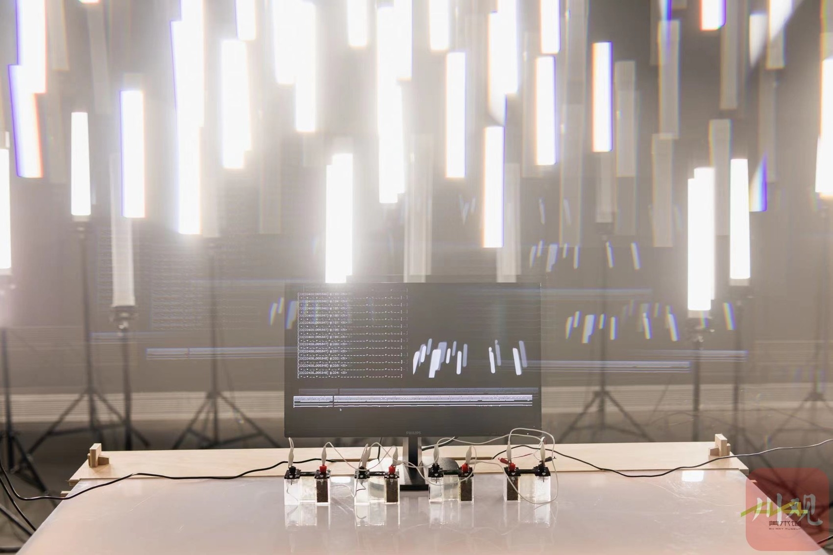 美术馆二楼的作品《微·节奏》是一件生物驱动的声音装置。艺术家采集了麓湖·A4美术馆周围的水和土壤样本,通过技术手段将其中微生物细胞内细微的电压变化,转化为现场十余盏灯光的明灭;随后,灯光变化产生的数据,又被采集并发送到一个辅助型学习机器上,呈现为图像化的乐谱,演奏出不断变化的滴答声。
