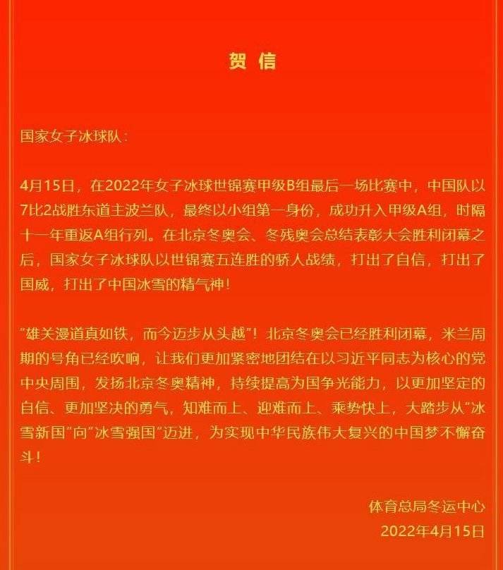 北京时间4月15日凌晨,2022年女子冰球世锦赛甲级B组最后一场比赛中,中国女子冰球队以7:2的比分战胜波兰队,以五战全胜的战绩夺得冠军,成功升入女子冰球世锦赛甲级A组,这也是中国女冰时隔11年重返世锦赛甲级A组。国家体育总局冬运中心第一时间向中国女冰发出了贺信,贺信中称赞中国女子冰球队“打出了自信,打出了国威,打出了中国冰雪的精气神!”