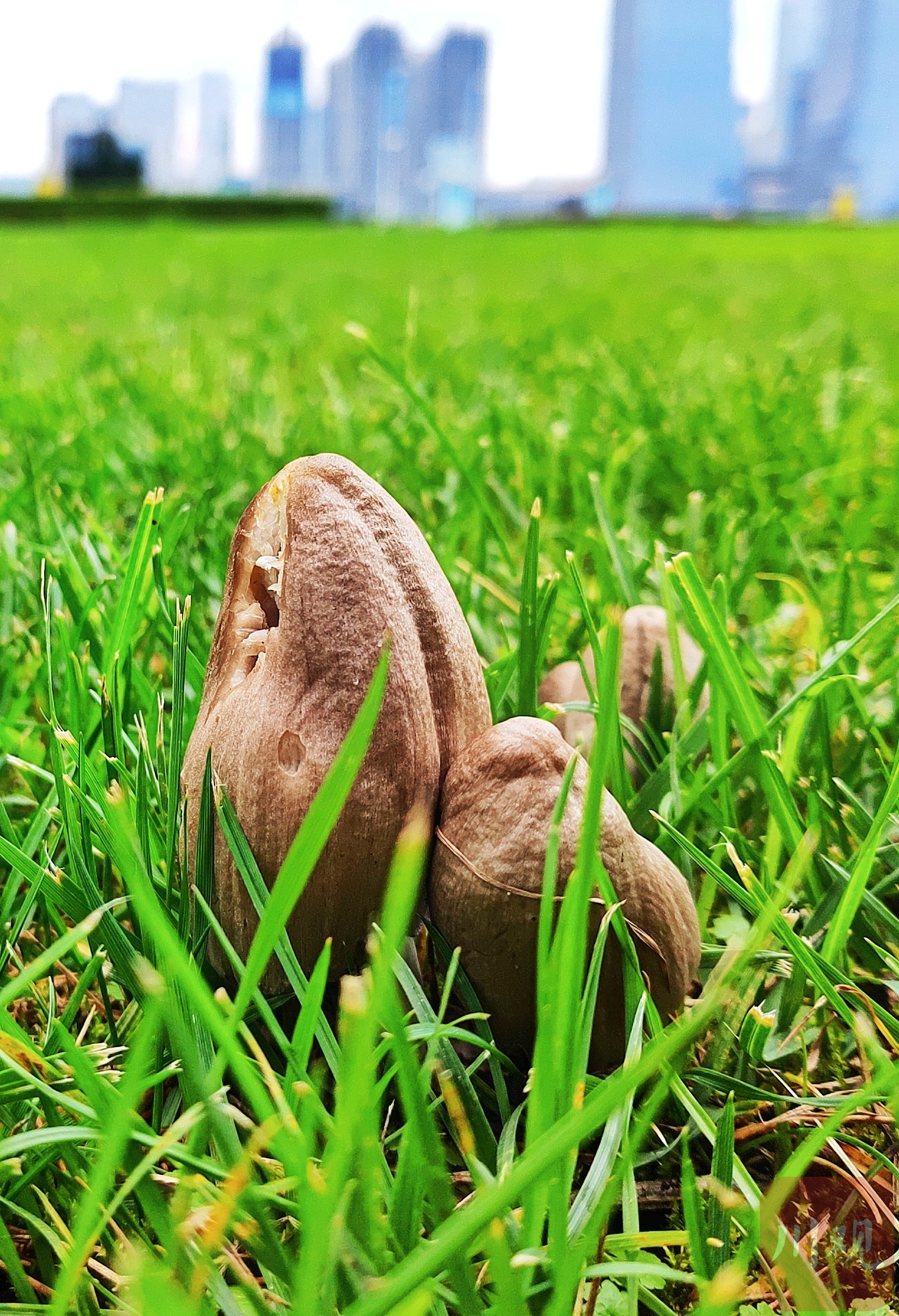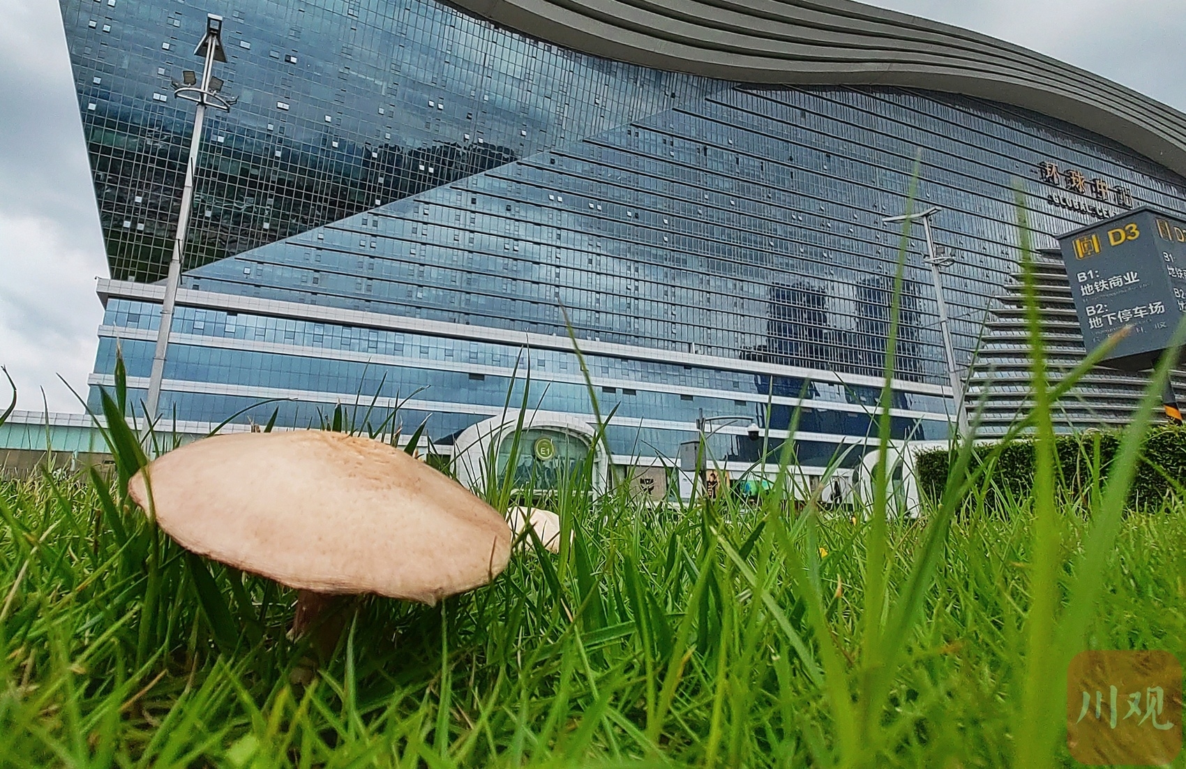 4月17日,四川在线记者在成都市锦城广场看到,经历持续阴雨天气后,广场草坪上冒出不少灰白色、浅棕色的菌子。它们有的呈伞柄状,有的呈圆球状,触手可及。