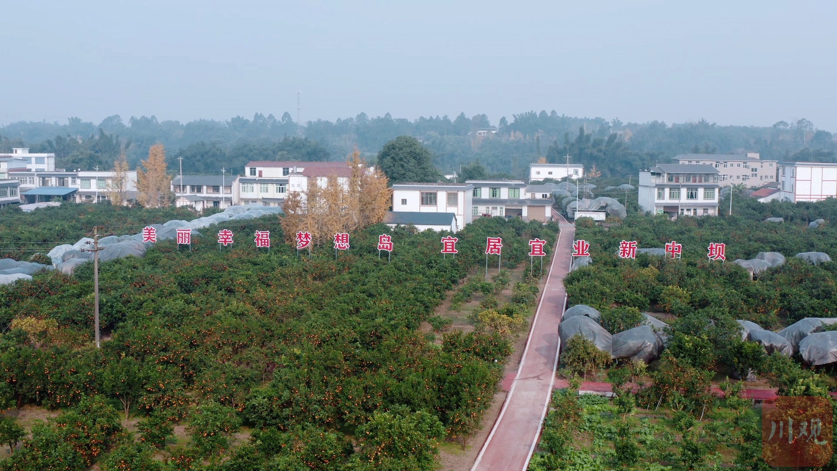 李亮带路,沿硬化路朝柑橘基地观景台走去。记者的第一印象是,这里的柑橘树比别处都要矮一些,枝头的果子一般伸手就能够到。第二印象是干净,“田间地头走上一圈,都莫得泥巴。”记者朝他的脚上看去,旧旧的黑布鞋上只有些许灰尘,“如今变化太大了,绿色是基调。”