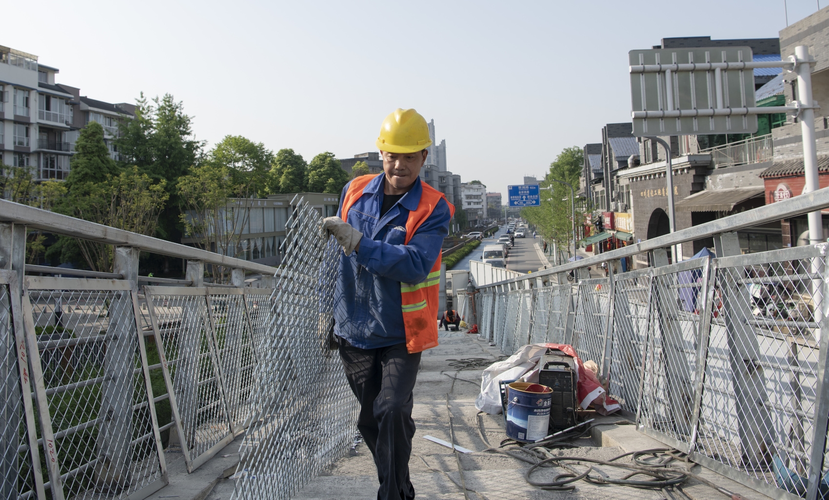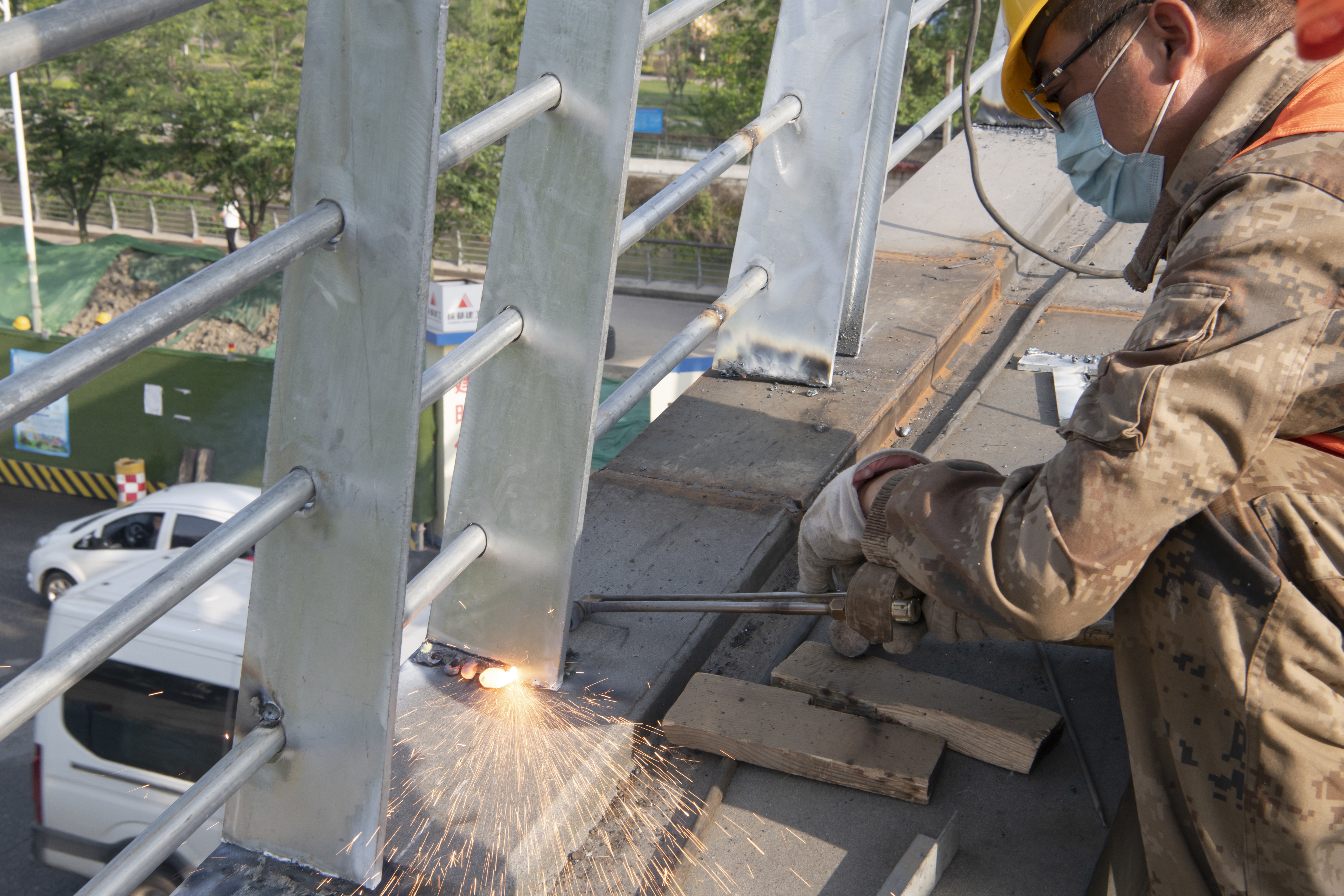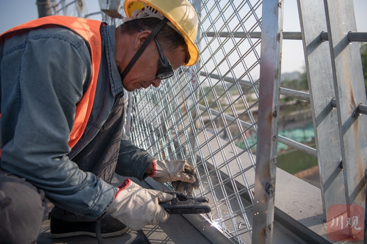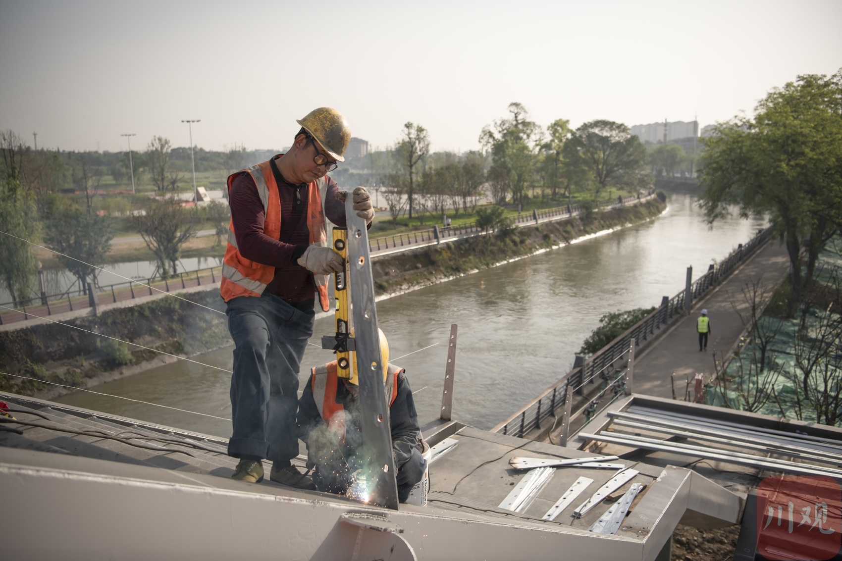 近日,成都彭州滨河路景观人行天桥“升平桥”主体工程完工。4月23日,川观拍客在现场看到,尽管天气较热,阳光直晒,但工人们都不惧辛劳,加班加点焊接一些必要的零件、装饰,安装桥上的围栏。五一劳动节即将到来,他们此时的付出,正是为了争取在5月1日前让这座景观天桥正式亮相。