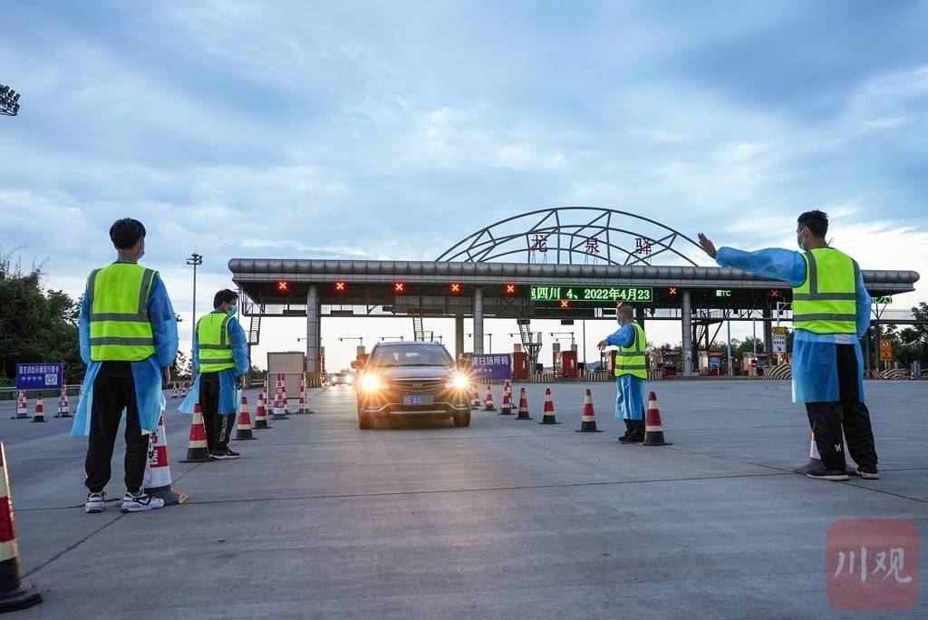 4月24日,在渝蓉高速龙泉驿收费站,防疫人员正有条不紊地检查所有来(返)川人员的48小时内核酸检测阴性证明、健康码和通信行程卡,同时还要求来(返)川人员扫描“入川码”。
