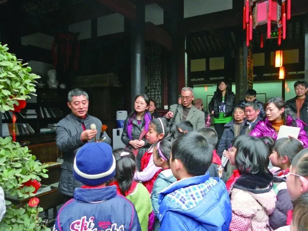 2014年,叶瑞琨在成都画院为孩子们讲解怎样选择毛笔