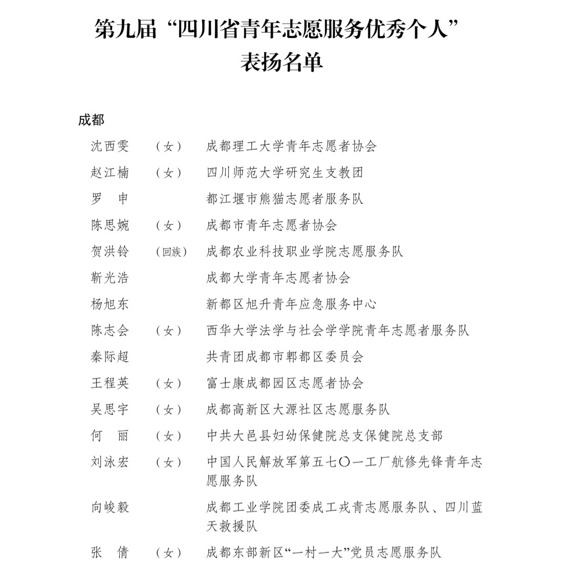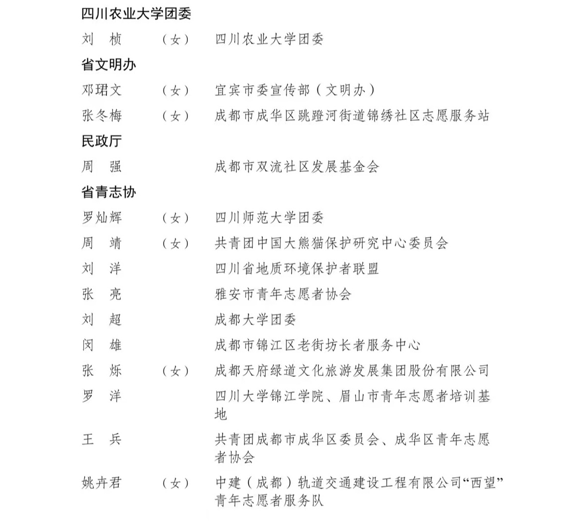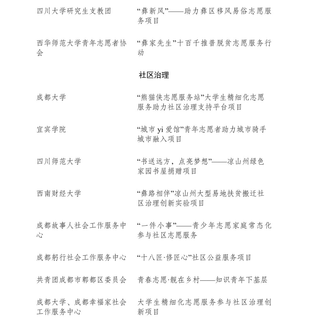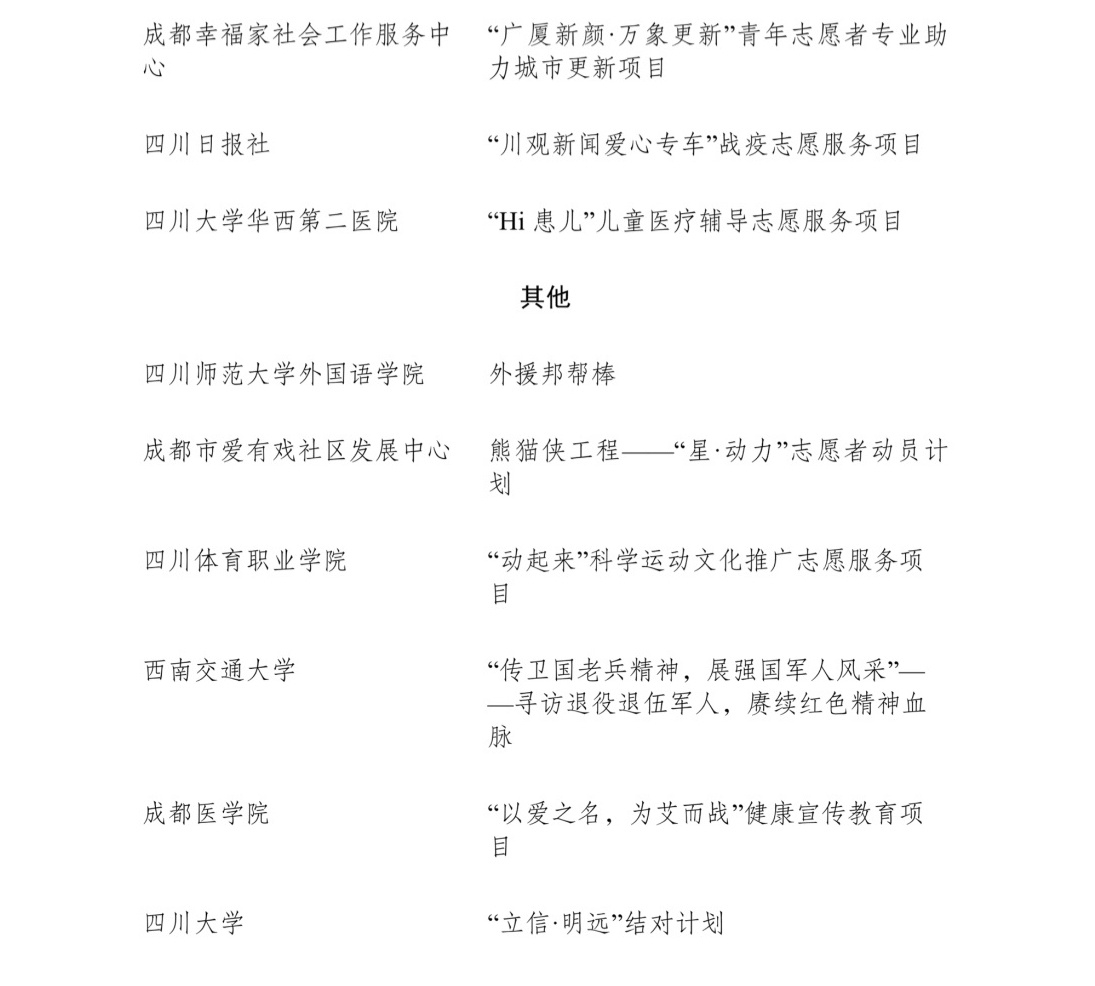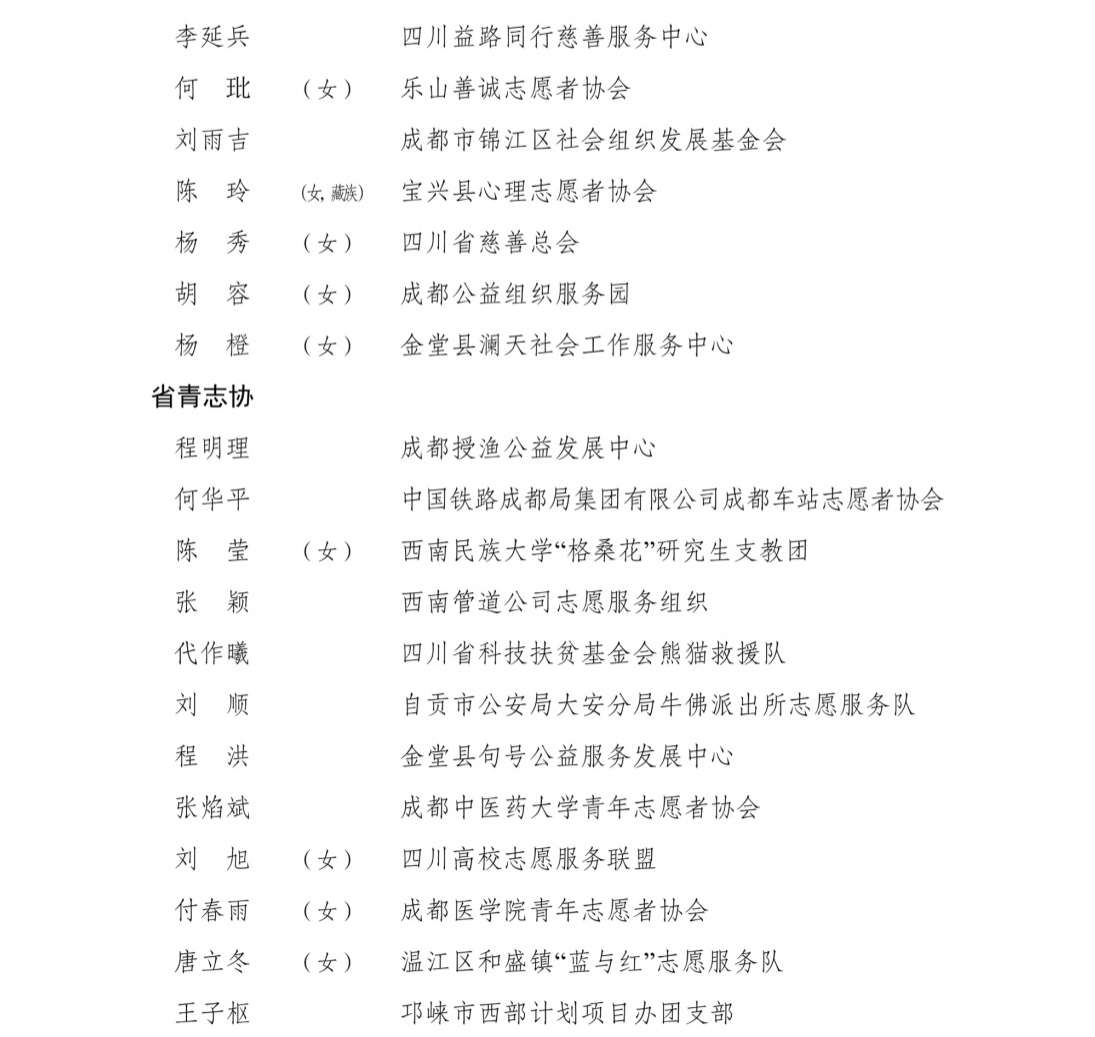 4月26日,记者从共青团四川省委获悉,为表扬先进、树立典型,共青团四川省委、四川省精神文明办公室、四川省民政厅联合开展了第九届四川省青年志愿服务优秀个人、工作者、组织和项目评选活动,沈西雯等150名个人获评第九届“四川省青年志愿服务优秀个人”,郭骏榕等50名个人获评第九届“四川省青年志愿服务优秀工作者”,崇州青年应急救援服务中心等50个组织获评第九届“四川省青年志愿服务优秀组织”,“青马燎原——新时代乡村振兴传红群英会”等75个项目获评第九届“四川省青年志愿服务优秀项目”。
