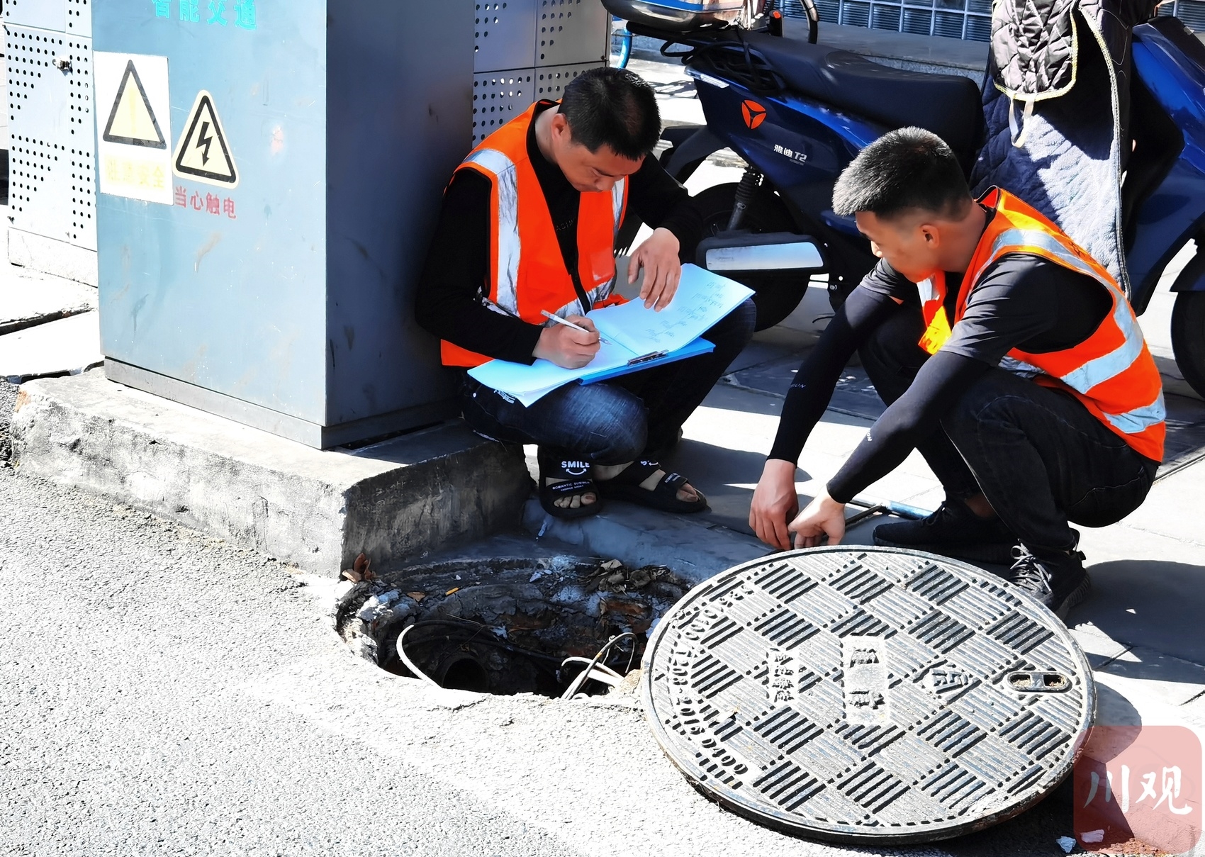 烈日之下检查井盖的维修人员