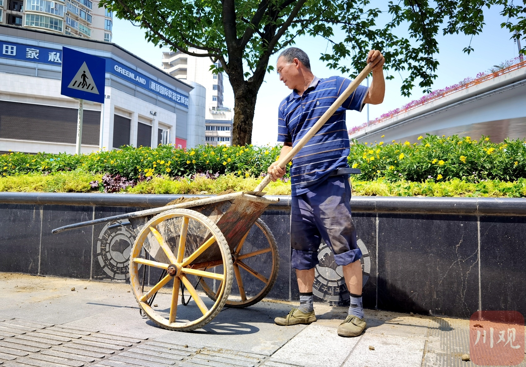 环卫工人为城市绿化带加土施肥