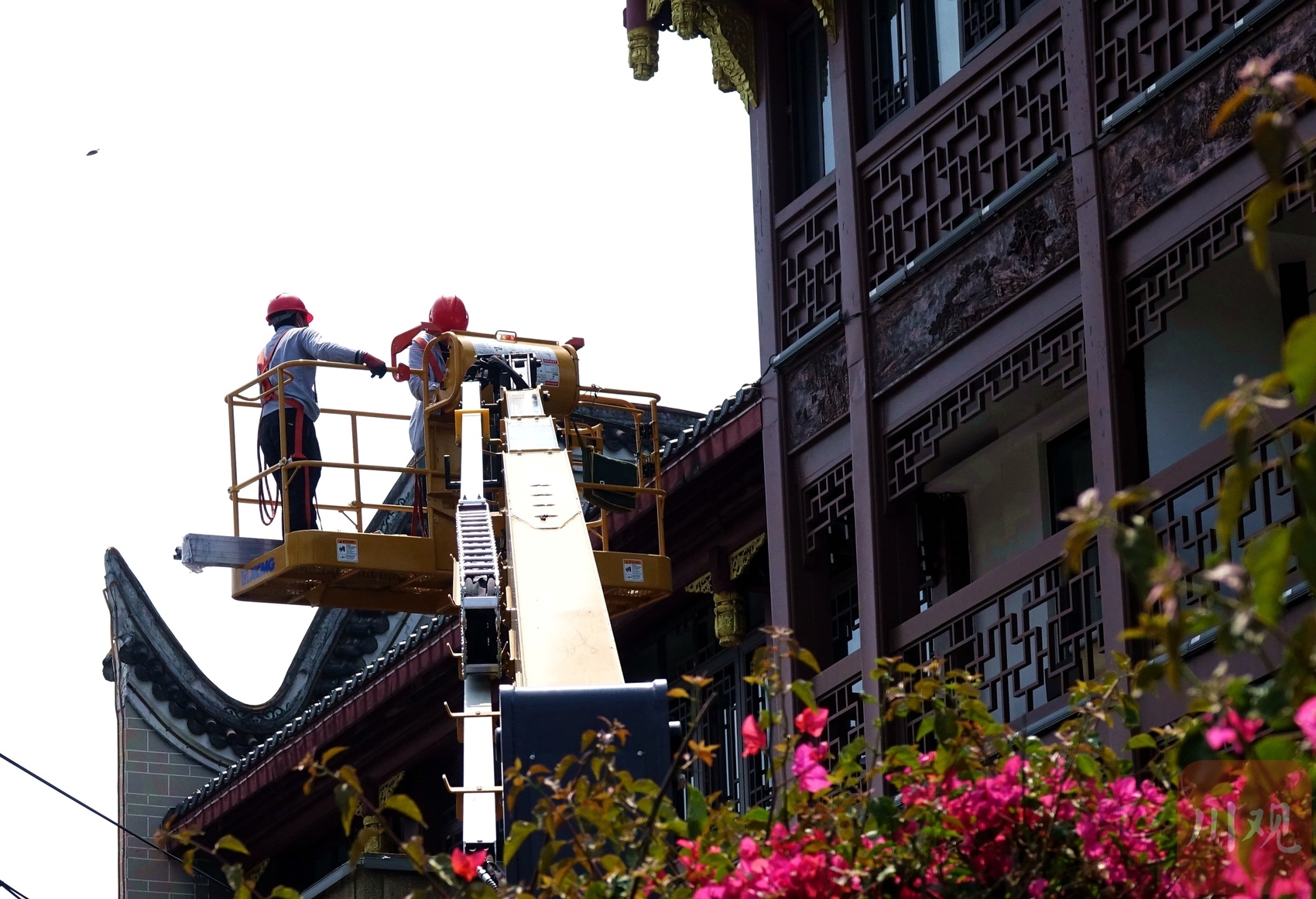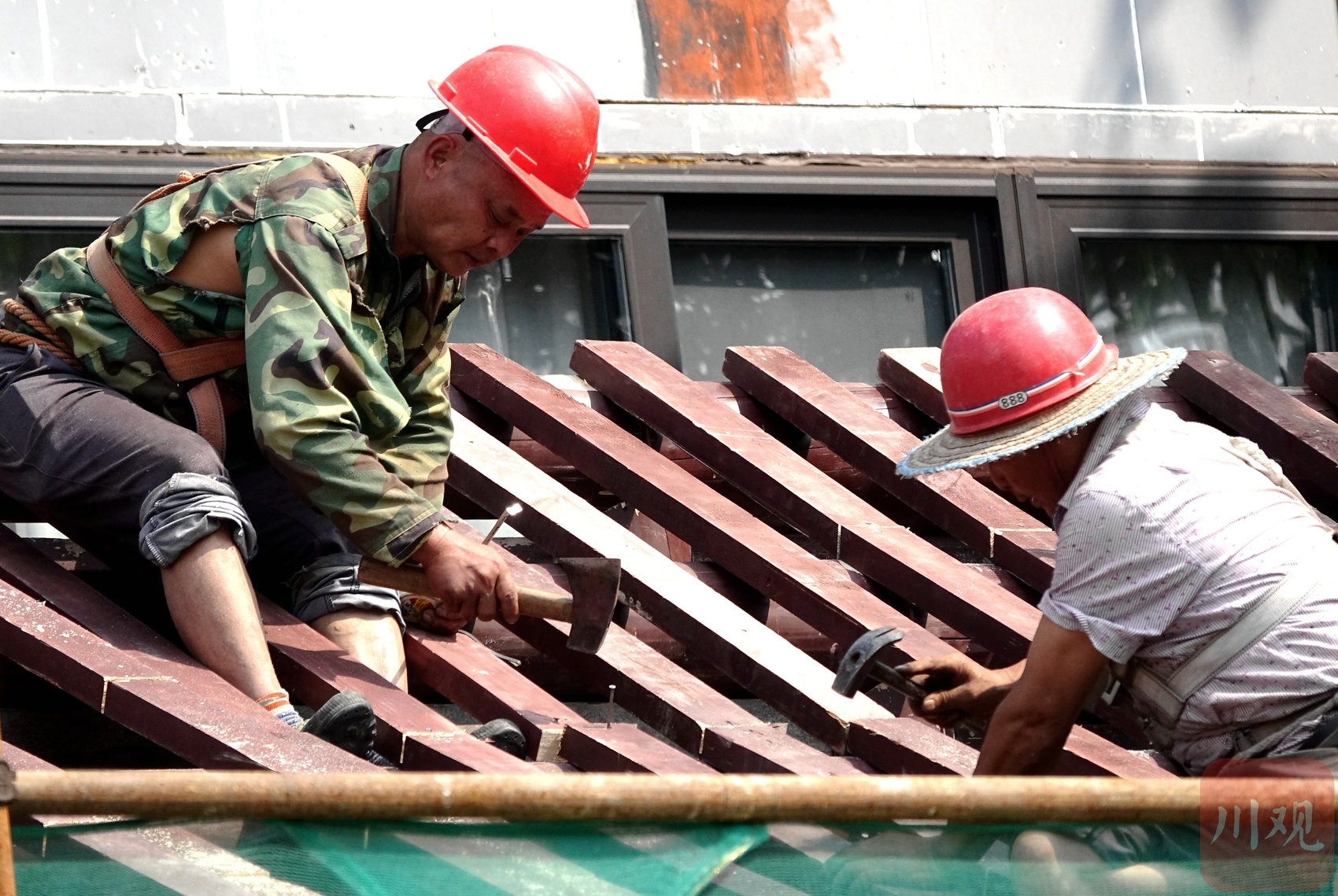 在琴台路维修建筑物屋顶的工人