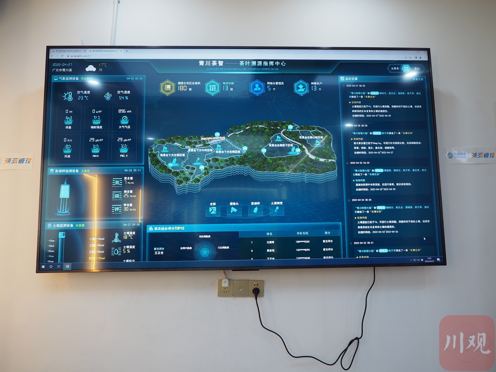 在青坪村村委会,四川在线记者见到“白叶一号”数字驾驶舱。驾驶舱连接了基地22个摄像头,通过它可以清晰看到每个地块茶苗的长势。