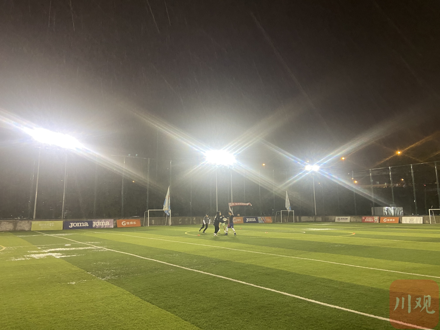 四月中旬的一天晚上,雨点打到神仙树一处足球场上,打湿了场上4人的T恤,但丝毫没有影响他们满场飞奔的脚步。“盘在边线,再往回传!”成都飞盘大队教练、FeipanDa Sport主理人赵宸的喊声穿越了风雨。