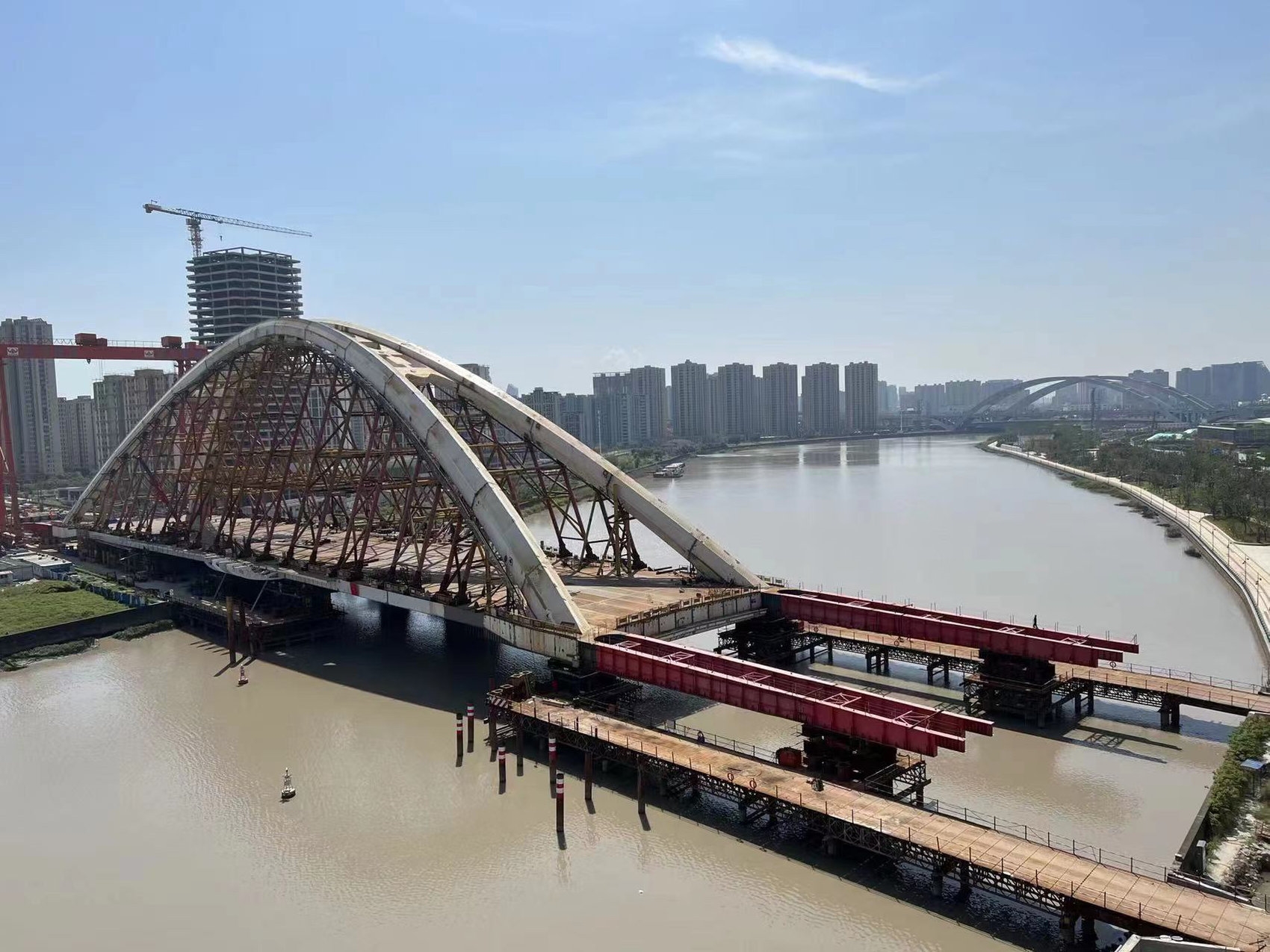 为攻克难关,自2019年12月开工以来,项目部迎难而上、多措并举,与上海同济大学等多家科研院所联合攻关,形成了“对梁底大变坡拱桥采用整体顶推施工”等一大批技术成果,全面攻克了梁底纵坡大、“强拱柔梁”主体结构刚度和承载力小、施工过程结构受力安全风险大等难题,创造性地运用了钢混组合桩结构形式,并将拱肋安装支架和拱梁顶推临时撑杆合二为一,从而实现了顶推施工的技术创新和降本增效,这也是国内“对梁底大变坡拱桥采用整体顶推施工”工艺的首次成功应用。