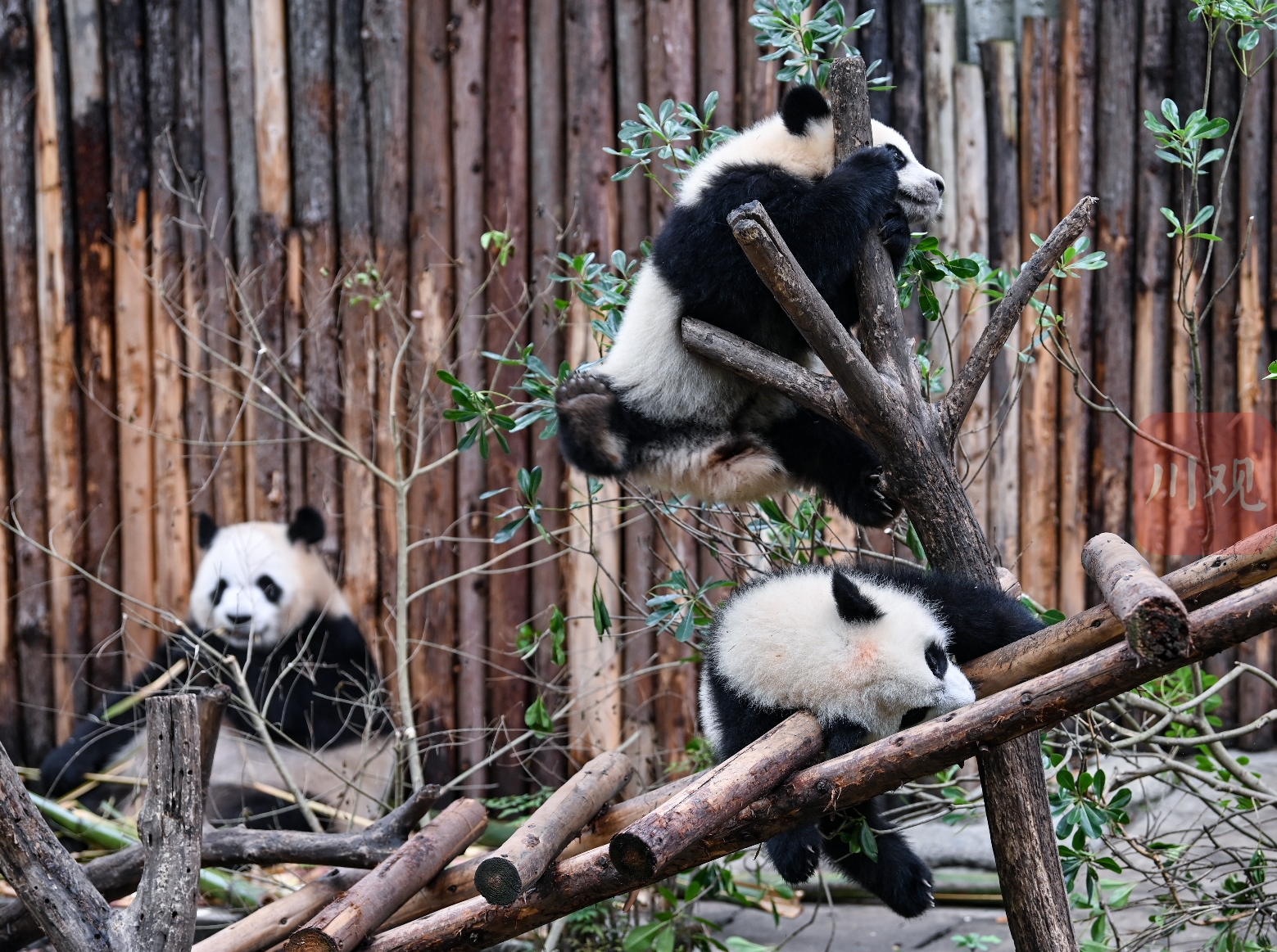 在基地月亮产房内,去年刚出生的大熊猫在树上玩得正高兴,不时的耍萌,吸引着游客驻足拍照。观看大熊猫时,游客也保持安全距离参观。