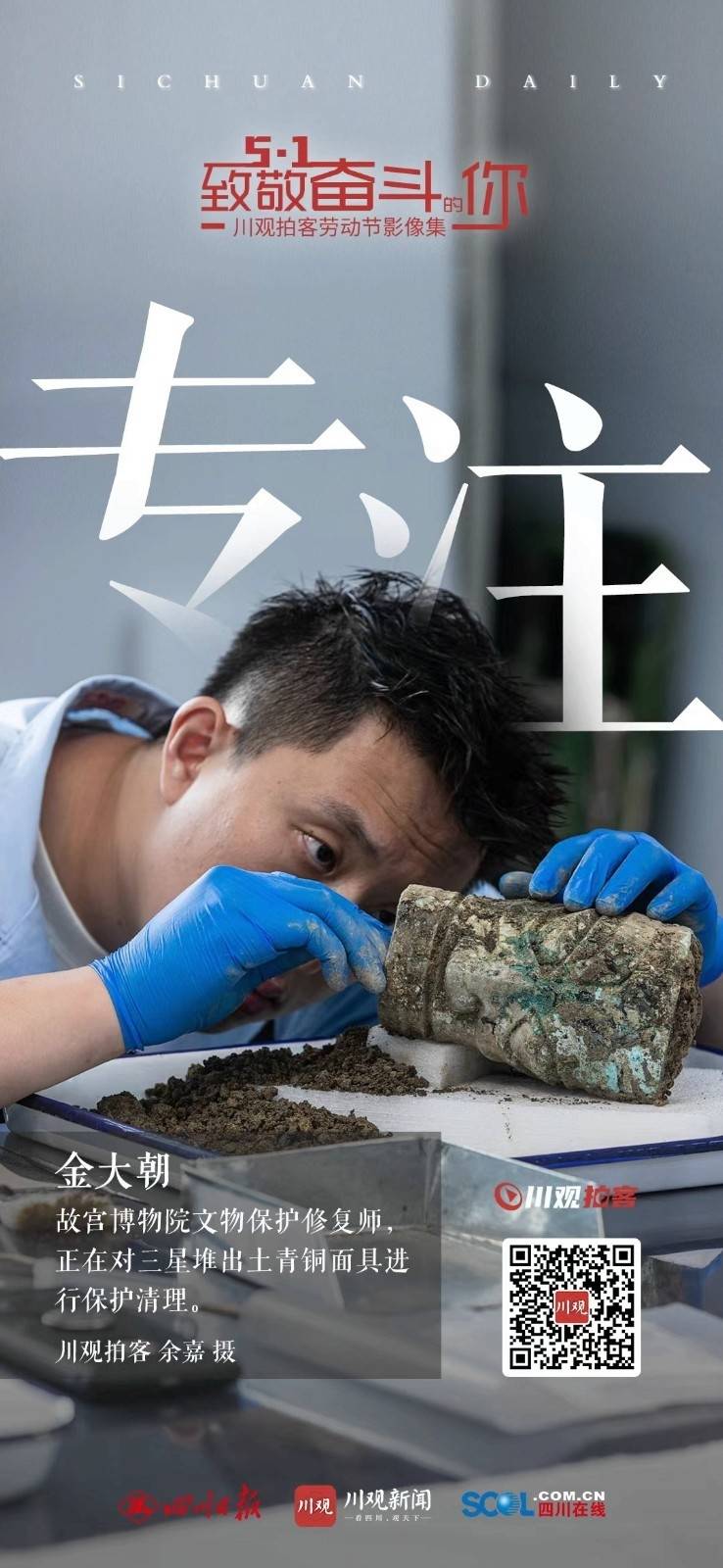 金大朝,故宫博物院文物保护修复师,正在对三星堆出土青铜面具进行保护清理。