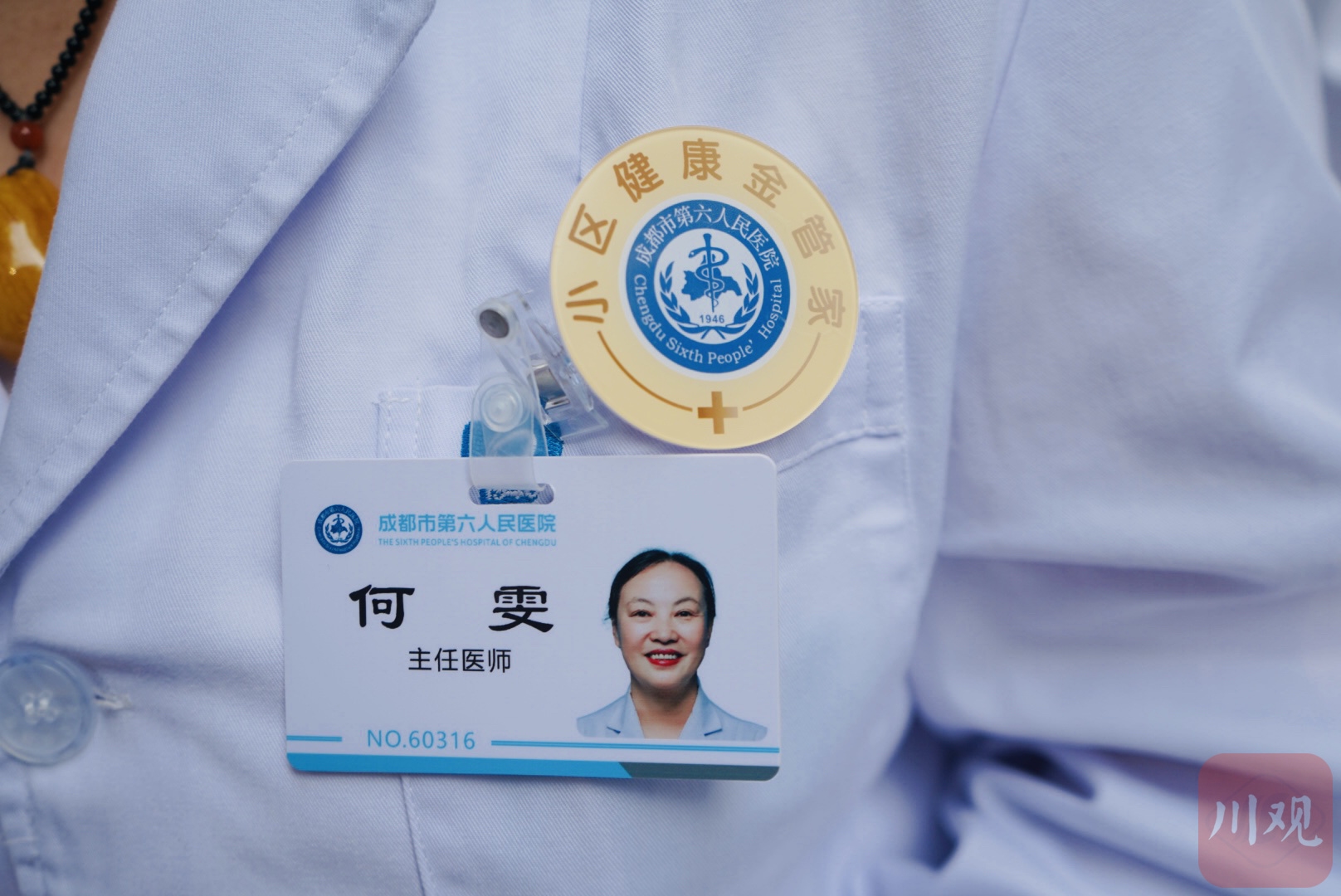 成都六医院妇产科主任医师何雯向记者展示她的管家胸牌。魏冯 摄