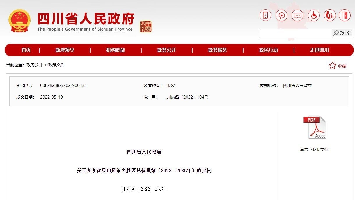 5月11日晚,四川省人民政府发布关于龙泉花果山风景名胜区总体规划(2022—2035年)的批复,原则同意《龙泉花果山风景名胜区总体规划(2022—2035年)》。
