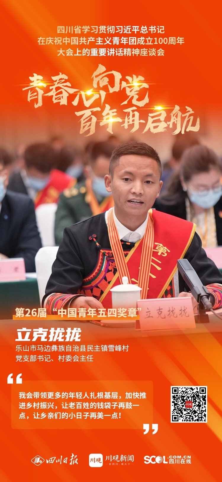 会上,共青团四川省委书记张荣,乐山市马边彝族自治县民主镇雪峰村党支部书记、村委会主任立克拢拢,中铁二院高原铁路项目副总设计师、青年突击队负责人毕强等7位代表作了交流发言,彰显了新时代四川青年的责任担当和奋斗激情。他们纷纷表示,将坚定理想信念,矢志拼搏奉献,勇于开拓创新,坚持勤学笃行,弘扬新风正气,争做有理想、敢担当、能吃苦、肯奋斗的新时代好青年,在全面建设社会主义现代会四川新征程中贡献青春力量,在实现中华民族伟大复兴中续写青春荣光。