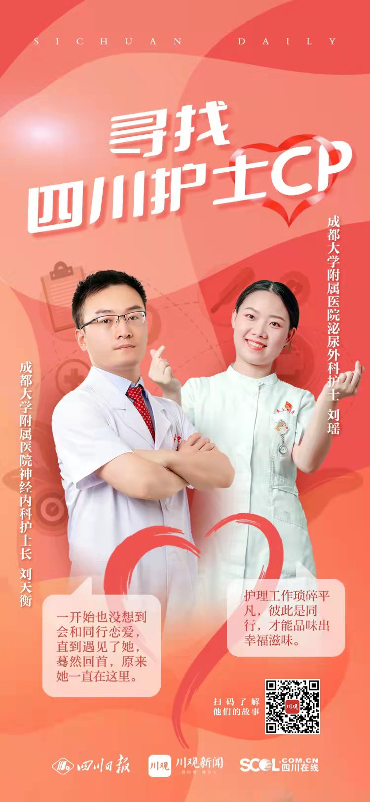 在成都大学附属医院工作的泌尿外科护士刘瑶,是刘天衡的妻子。她则表示,“护理工作繁忙琐碎,因为彼此都是同行,更能相互理解和支持,还能衍生更多合作,在生活和工作中收获了双份依靠。”