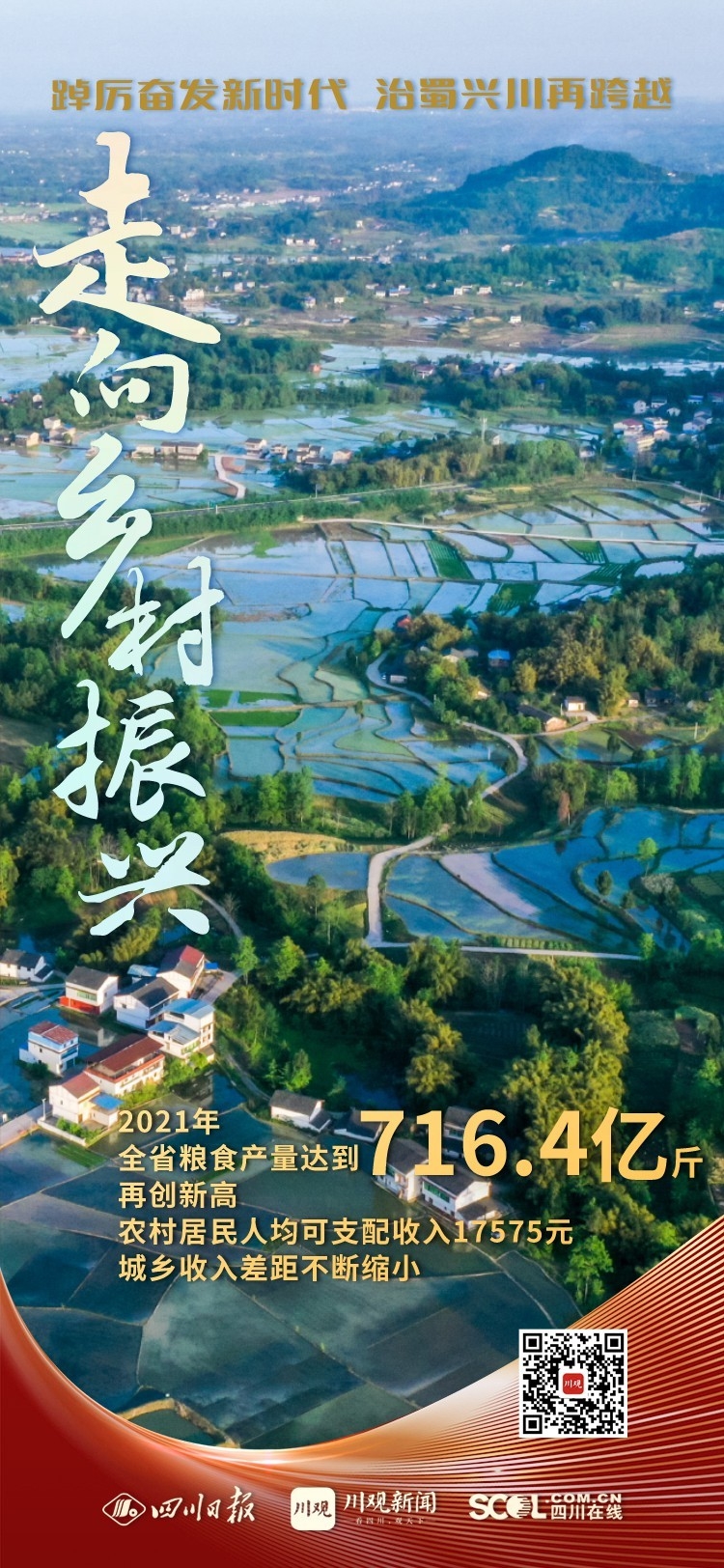 五年来,按照产业兴旺、生态宜居、乡风文明、治理有效、生活富裕的总要求,四川省不断推动农业全面升级、农村全面进步、农民全面发展。2021年全省粮食产量达到716.4亿斤,再创新高;农村人居环境持续改善,2021年农村卫生厕所普及率达87%;2021年全省农村居民人均可支配收入17575元,城乡收入差距不断缩小。