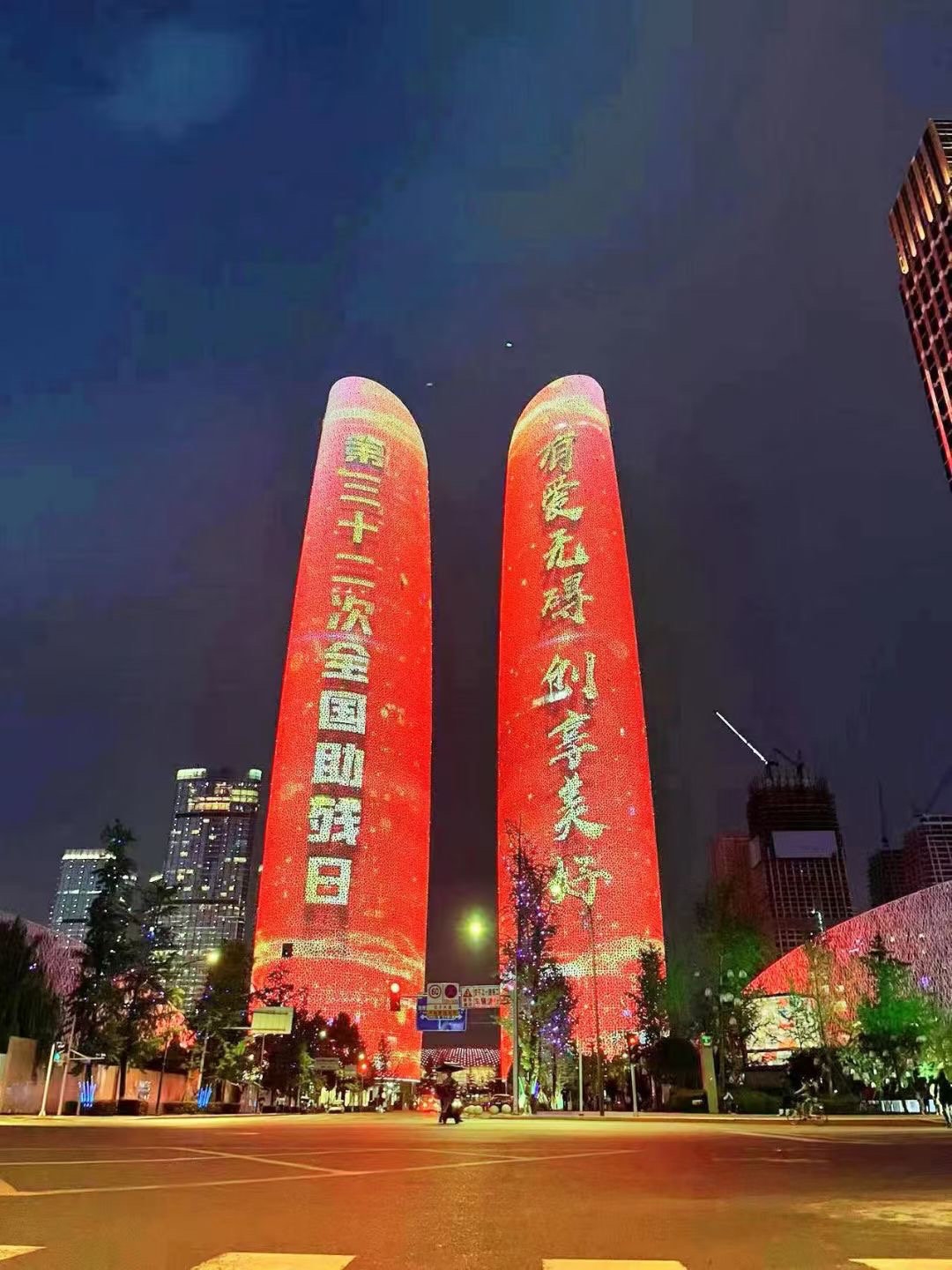 成都天府双塔为全国助残日亮灯。成都残联供图