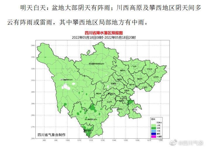 18日白天:盆地大部阴天有阵雨,其中宜宾、泸州、自贡、内江4市及广元、绵阳、巴中、达州4市北部有中雨,局部地方有大雨;川西高原及攀西地区阴天间多云有阵雨或雷雨,局部地方有中雨。24小时内,盆地最低气温:15~17℃;最高气温:19~22℃。