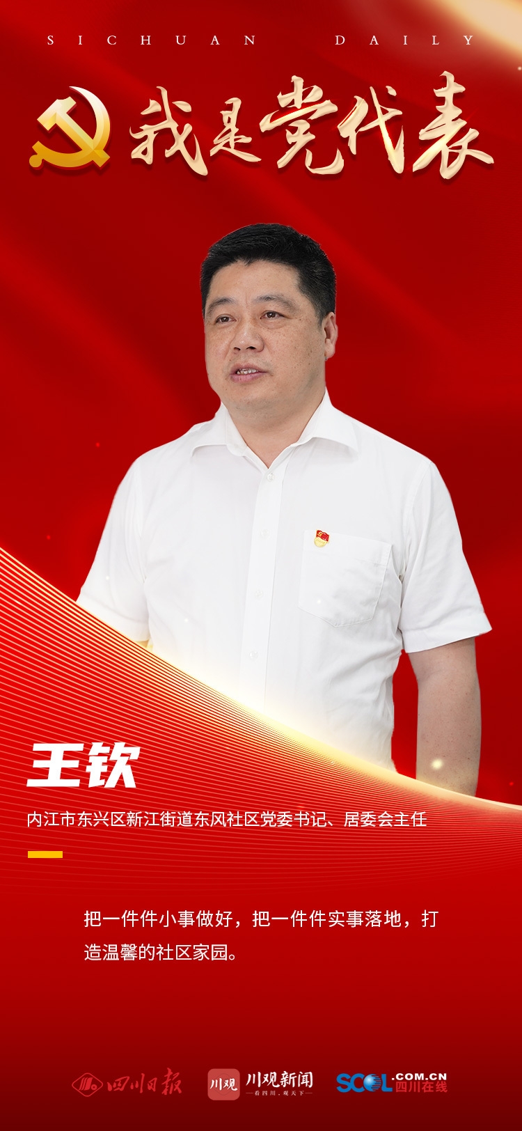 王钦,内江市东兴区新江街道东风社区党委书记、居委会主任,党龄18年,2021年全国优秀党务工作者、2019年四川省优秀党务工作者。他带头抓党建、搞卫生、谋发展,让曾经“脏乱差”的社区变成环境好、居民口碑好、社区服务好的“三好”社区。